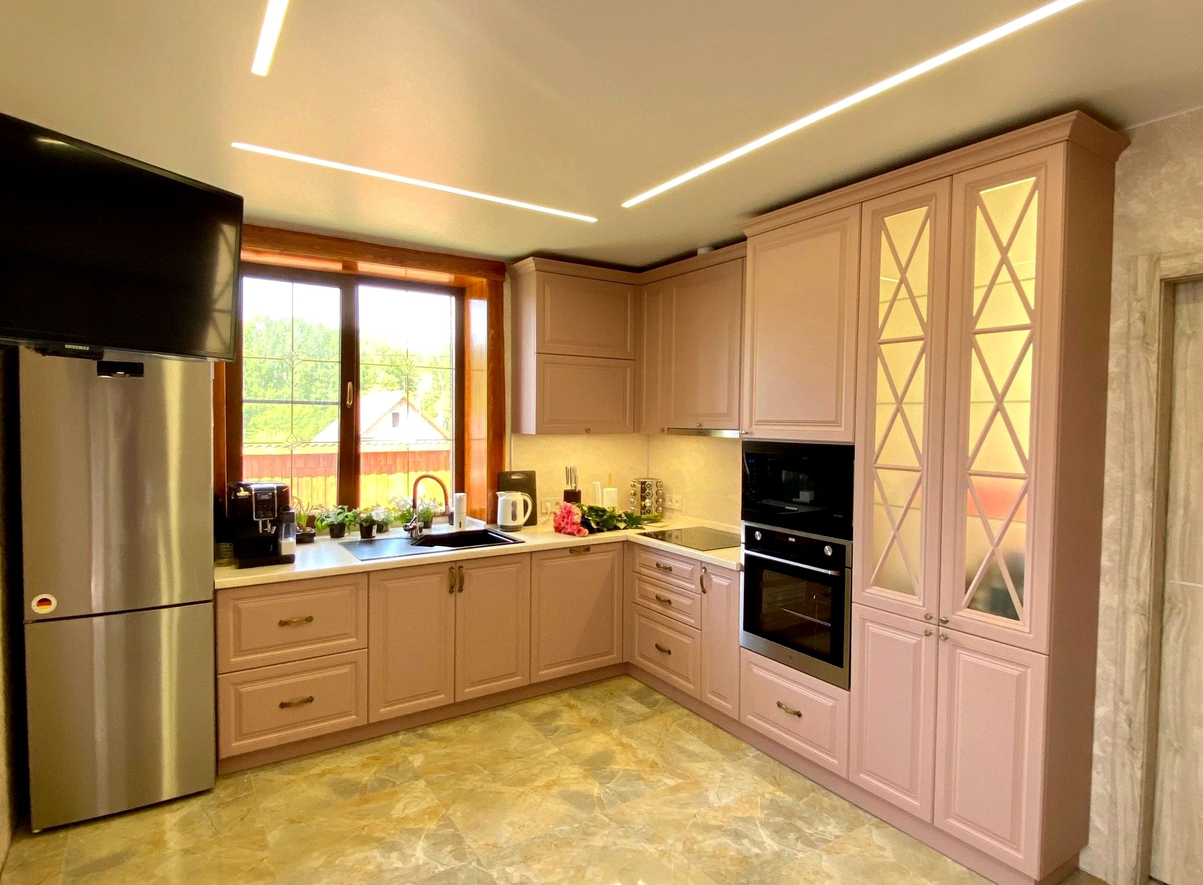 Угловая композиция, ЛДСП / МДФ, светлая текстура отделка. Светлый интерьер, теплая атмосфера, практичность для ежедневного использования