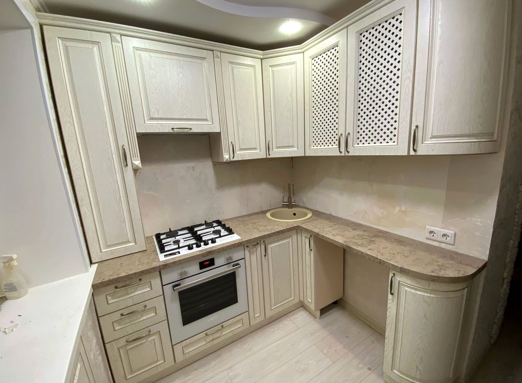 Угловая композиция, ЛДСП / МДФ, светлая текстура отделка. Светлый интерьер, теплая атмосфера, практичность для ежедневного использования