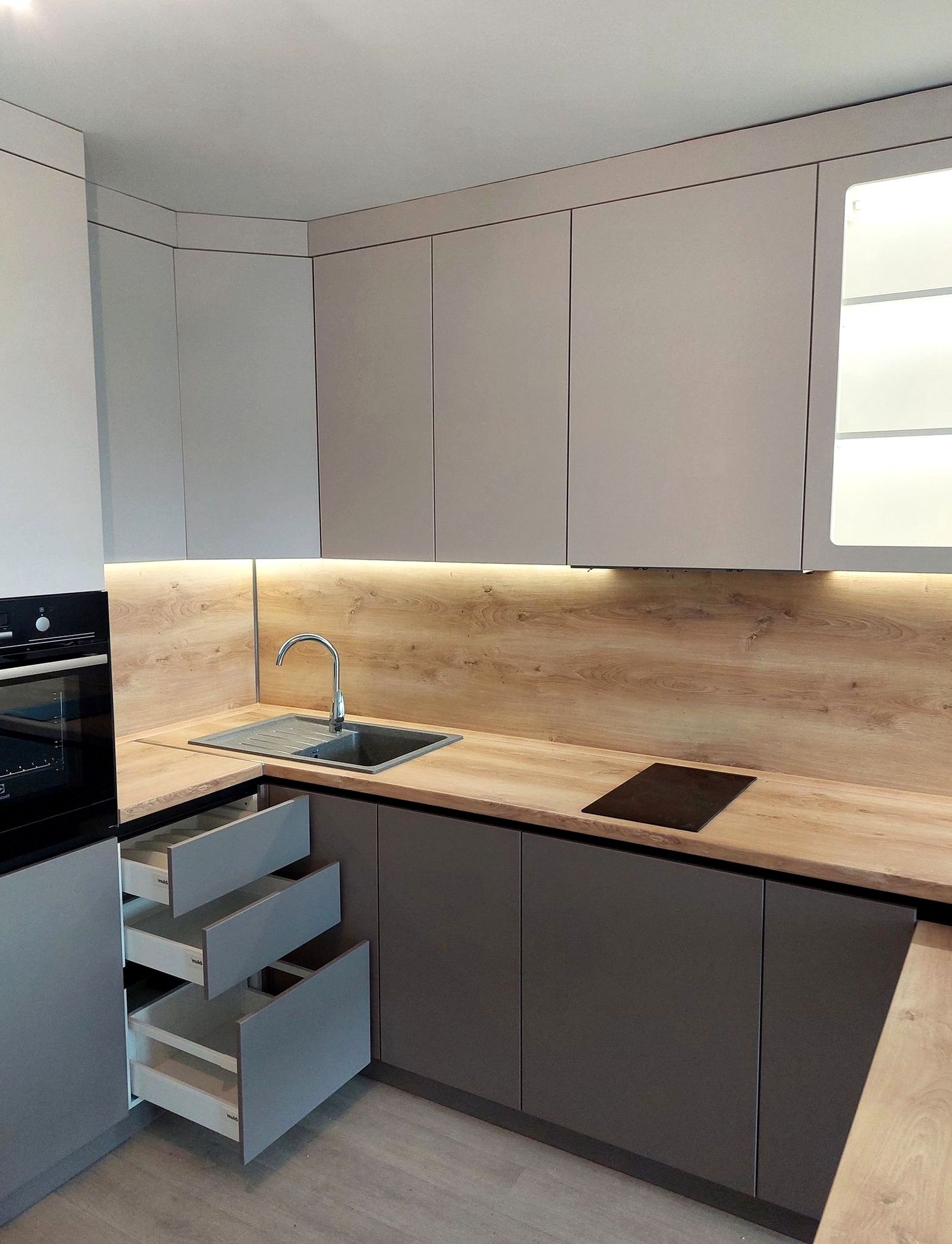 Угловая композиция, МДФ в пленке, супермат отделка. Эргономичная планировка, много хранения, актуальный городской интерьер