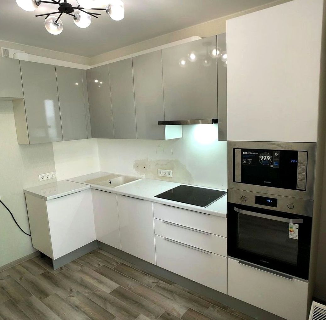 Угловая композиция, МДФ в пленке, супермат отделка. Эргономичная планировка, много хранения, актуальный городской интерьер