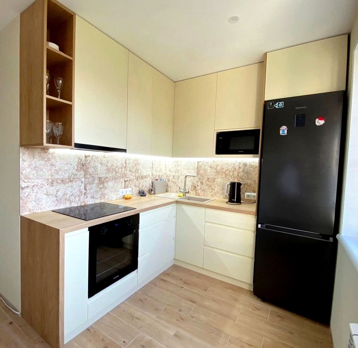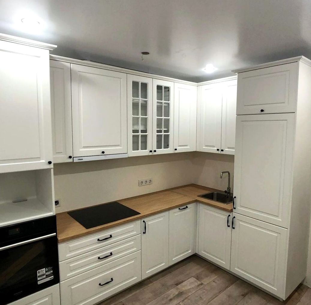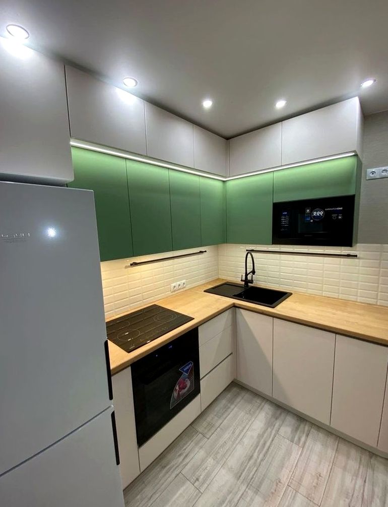 Угловая композиция, МДФ в пленке, супермат отделка. Эргономичная планировка, много хранения, актуальный городской интерьер