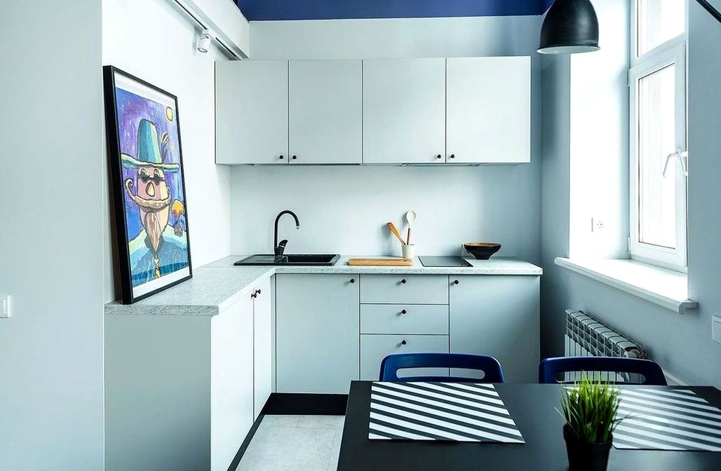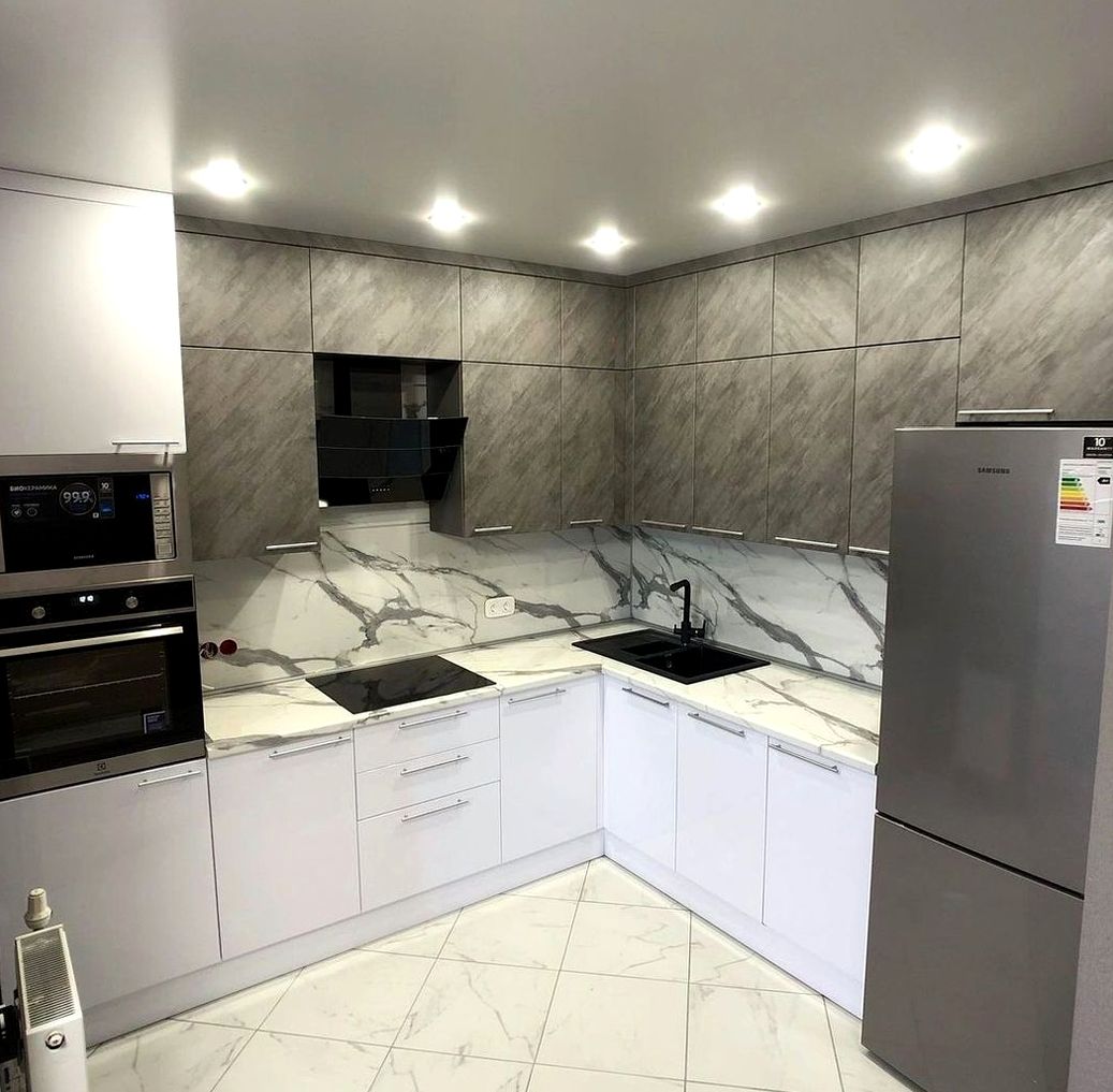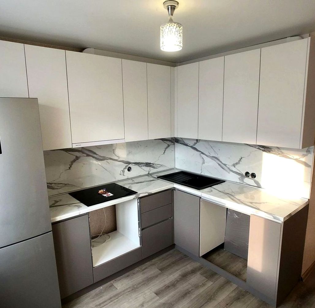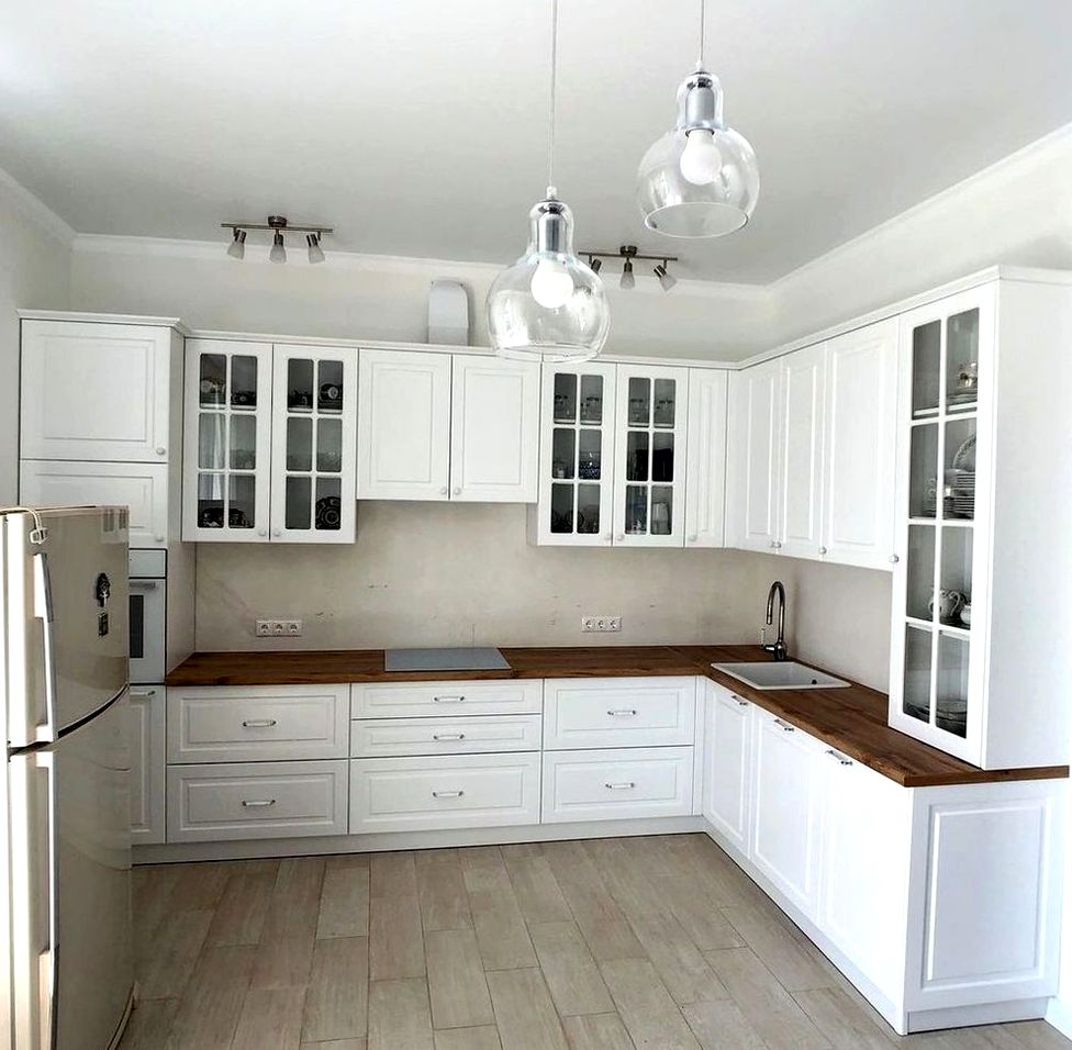 П-образная композиция, фрезерованный МДФ, матовая эмаль отделка. Мягкая классика, уют, аккуратные рамочные фасады без перегруза
