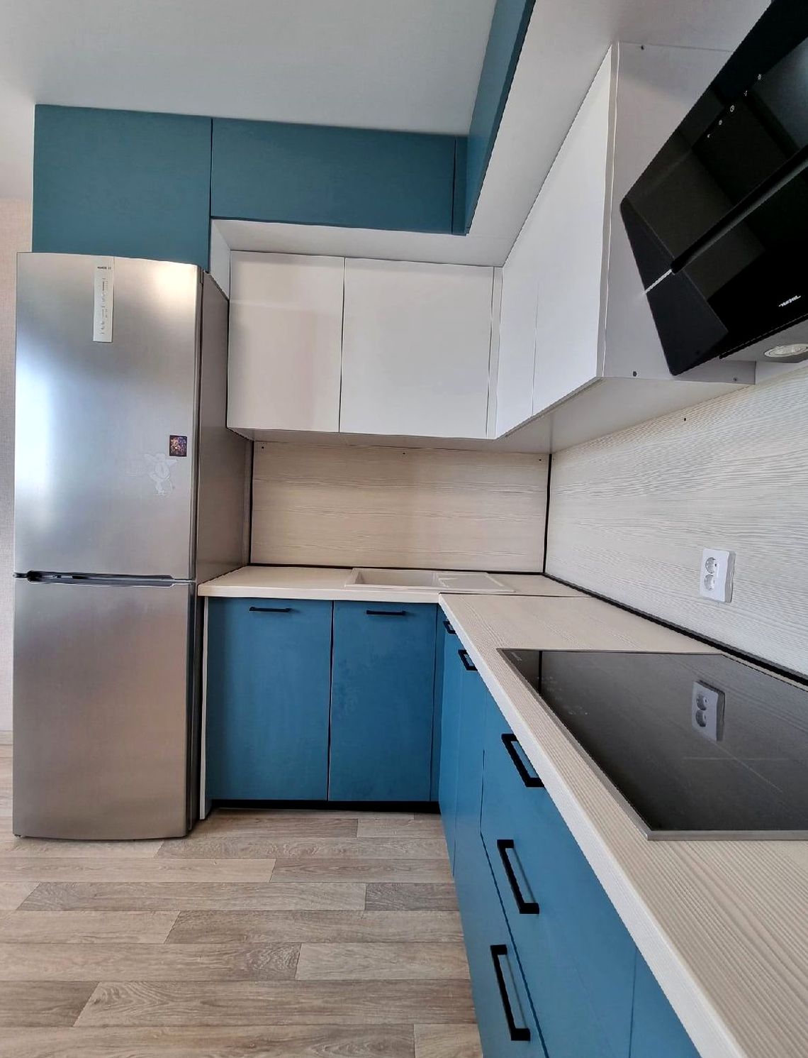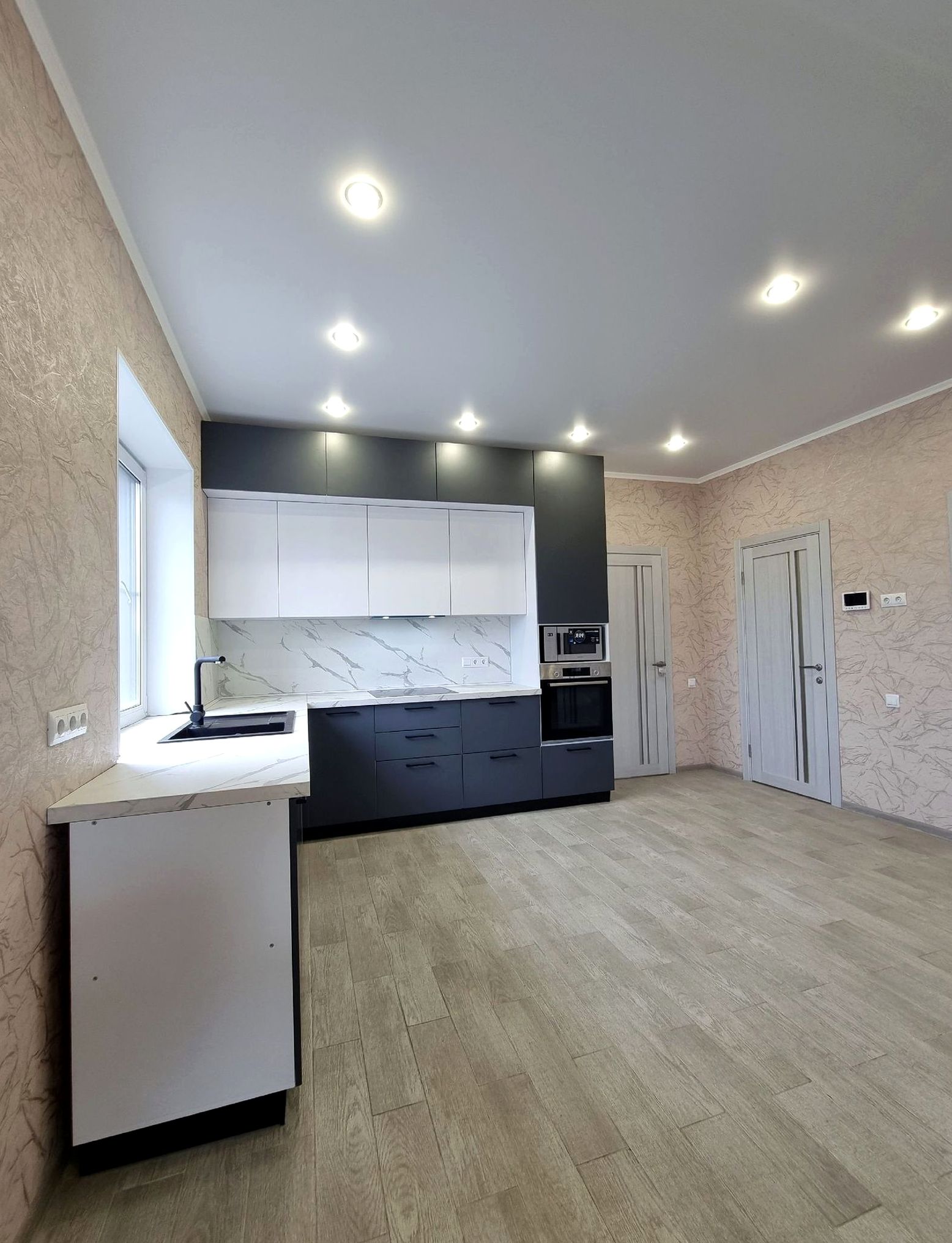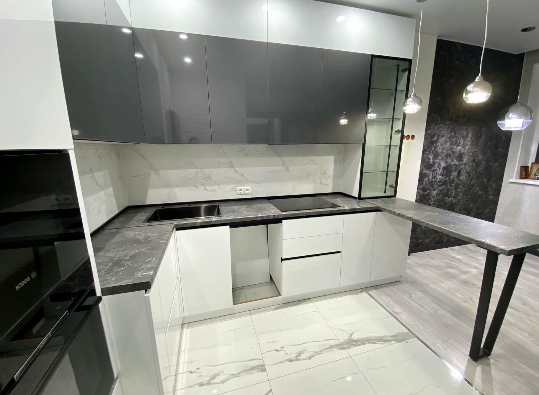 П-образная композиция, фрезерованный МДФ, матовая эмаль отделка. Мягкая классика, уют, аккуратные рамочные фасады без перегруза