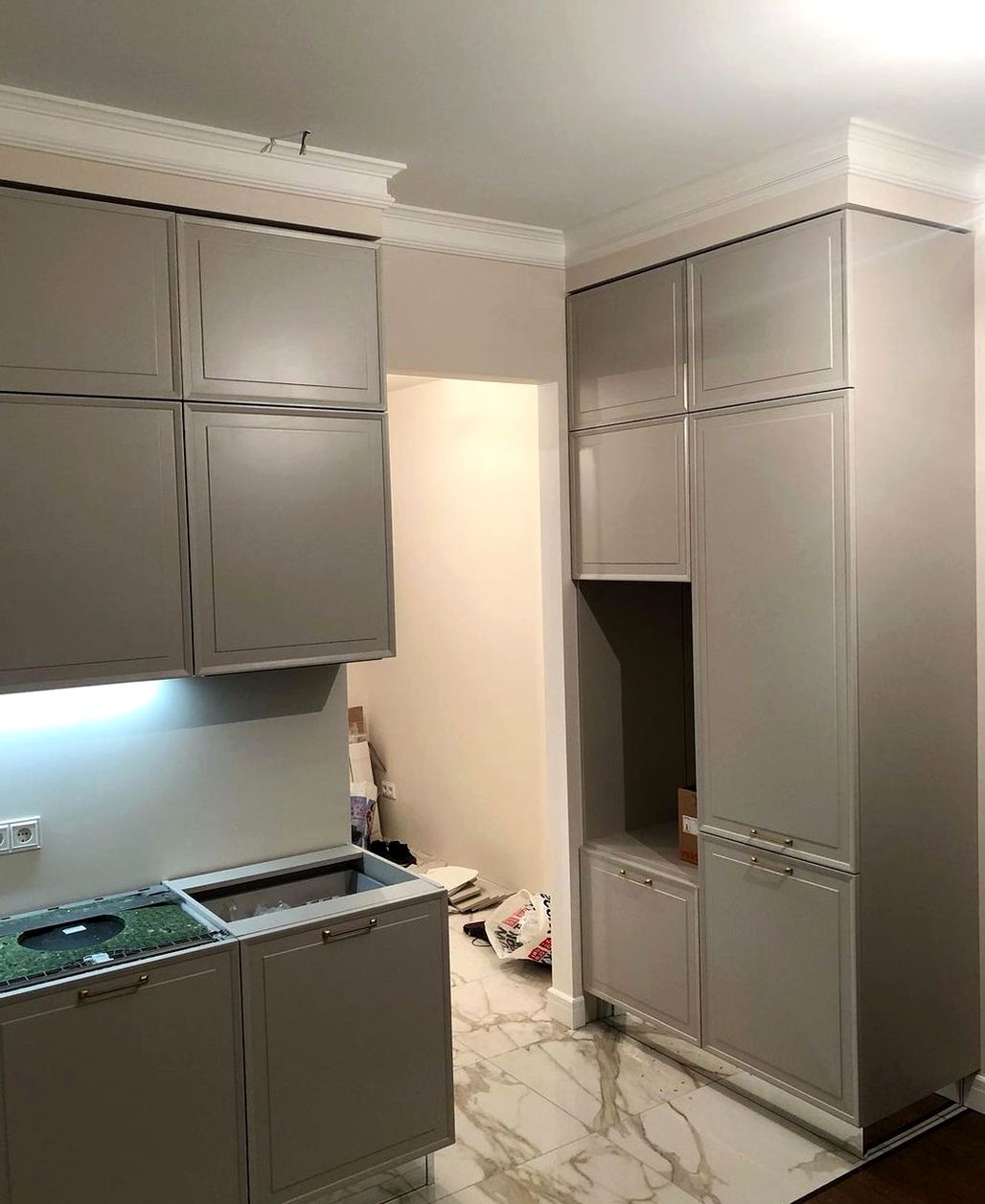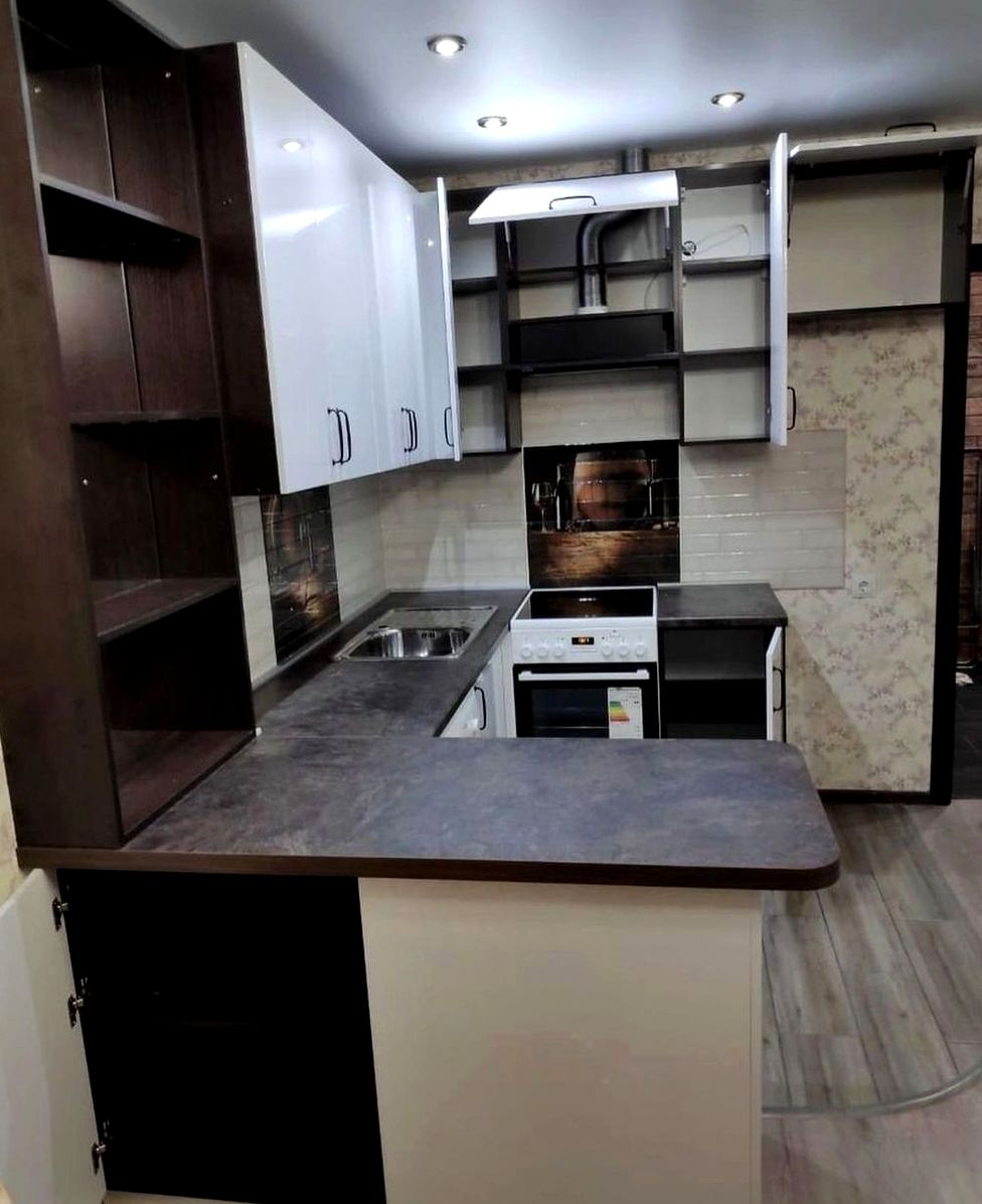 Угловая композиция, МДФ в пленке, супермат отделка. Эргономичная планировка, много хранения, актуальный городской интерьер