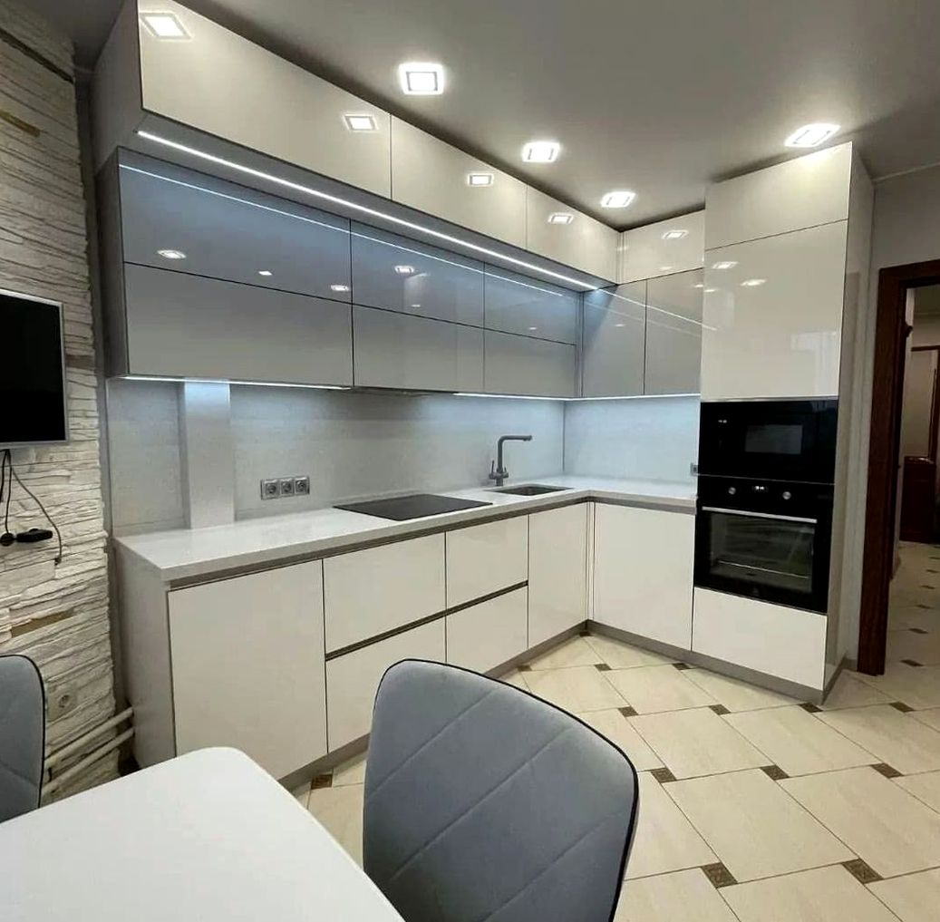 Угловая композиция, ЛДСП / МДФ, светлая текстура отделка. Светлый интерьер, теплая атмосфера, практичность для ежедневного использования