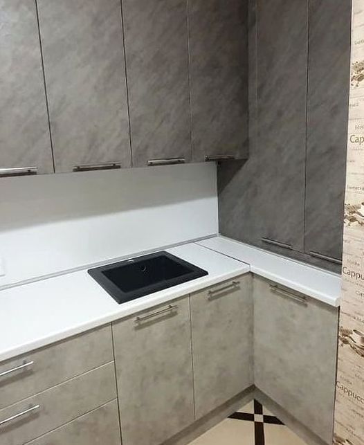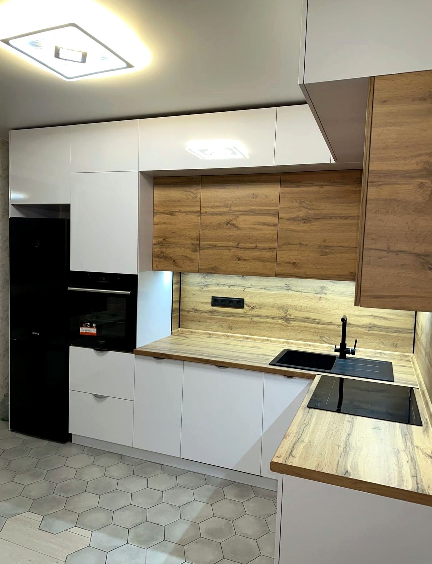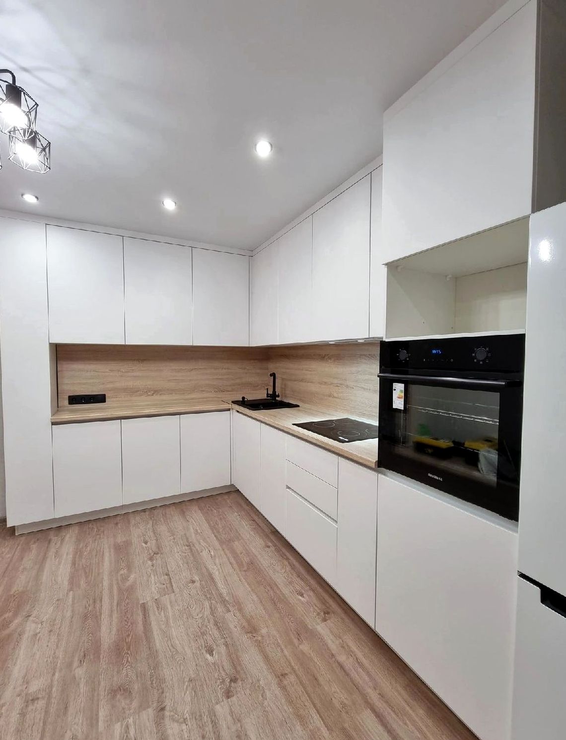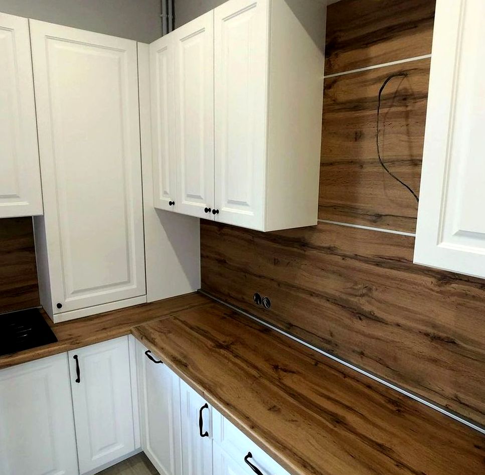 П-образная композиция, фрезерованный МДФ, матовая эмаль отделка. Мягкая классика, уют, аккуратные рамочные фасады без перегруза