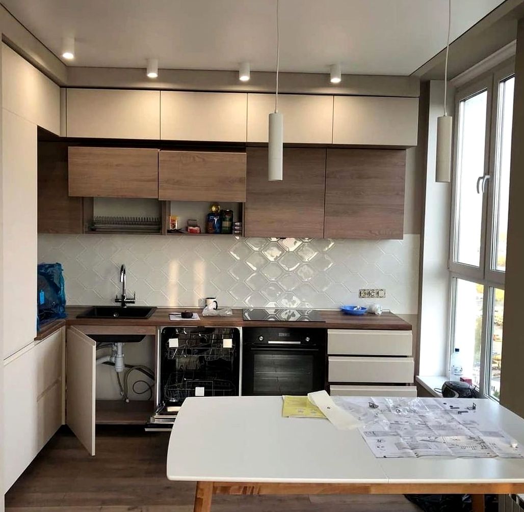 П-образная композиция, фрезерованный МДФ, матовая эмаль отделка. Мягкая классика, уют, аккуратные рамочные фасады без перегруза