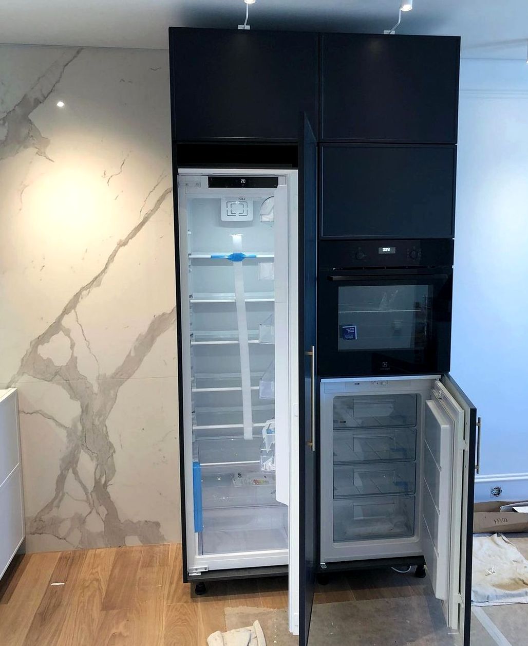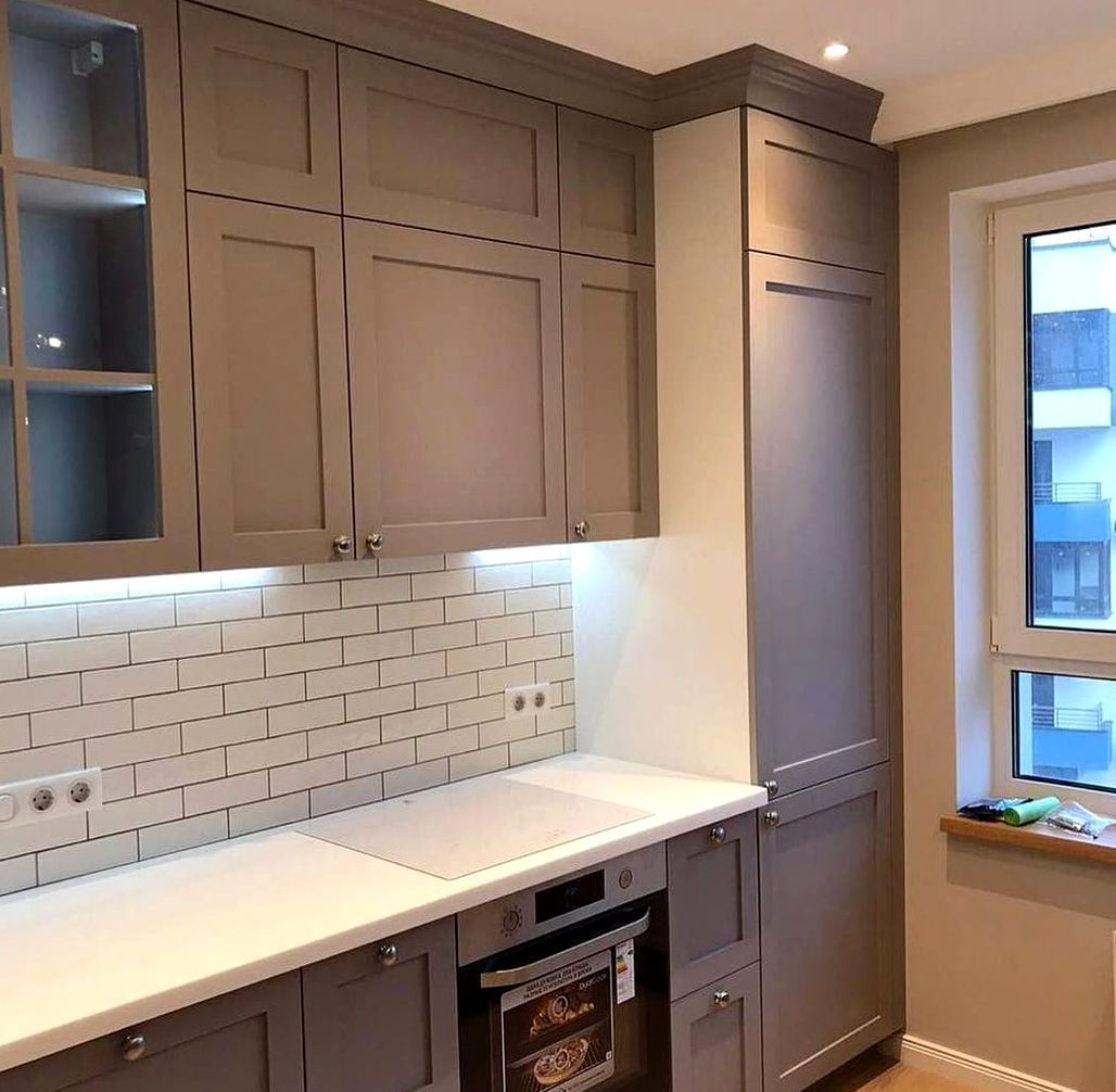 Угловая композиция, МДФ в пленке, супермат отделка. Эргономичная планировка, много хранения, актуальный городской интерьер