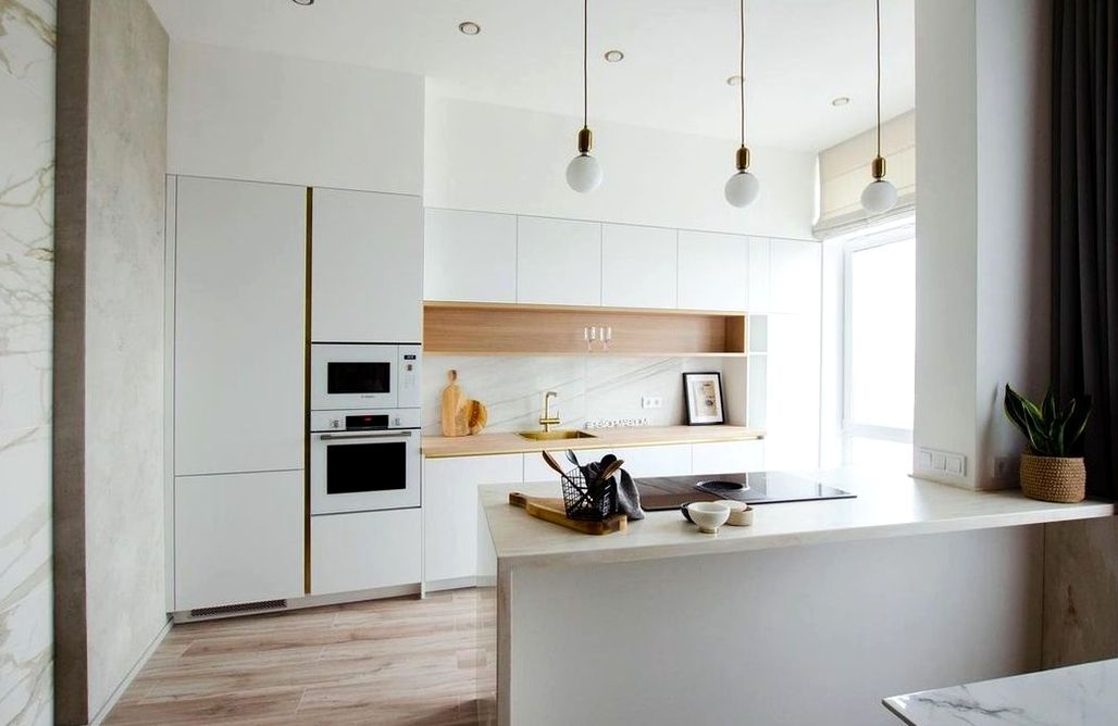 П-образная композиция, фрезерованный МДФ, матовая эмаль отделка. Мягкая классика, уют, аккуратные рамочные фасады без перегруза