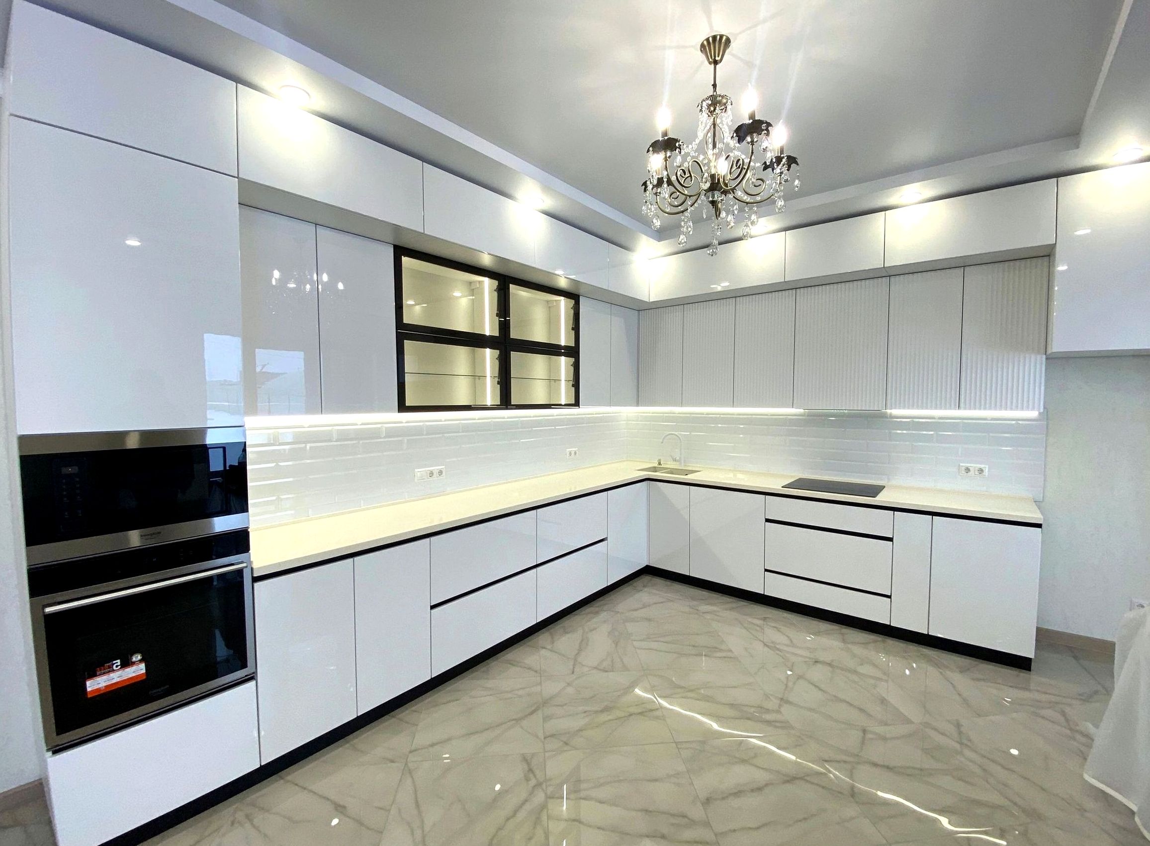 П-образная композиция, фрезерованный МДФ, матовая эмаль отделка. Мягкая классика, уют, аккуратные рамочные фасады без перегруза
