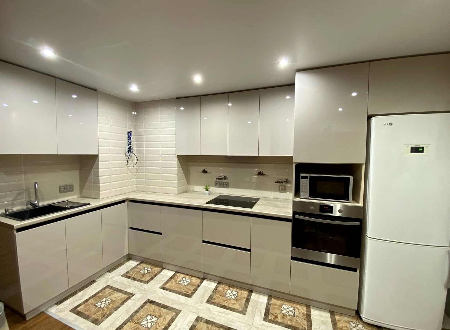 П-образная композиция, фрезерованный МДФ, матовая эмаль отделка. Мягкая классика, уют, аккуратные рамочные фасады без перегруза