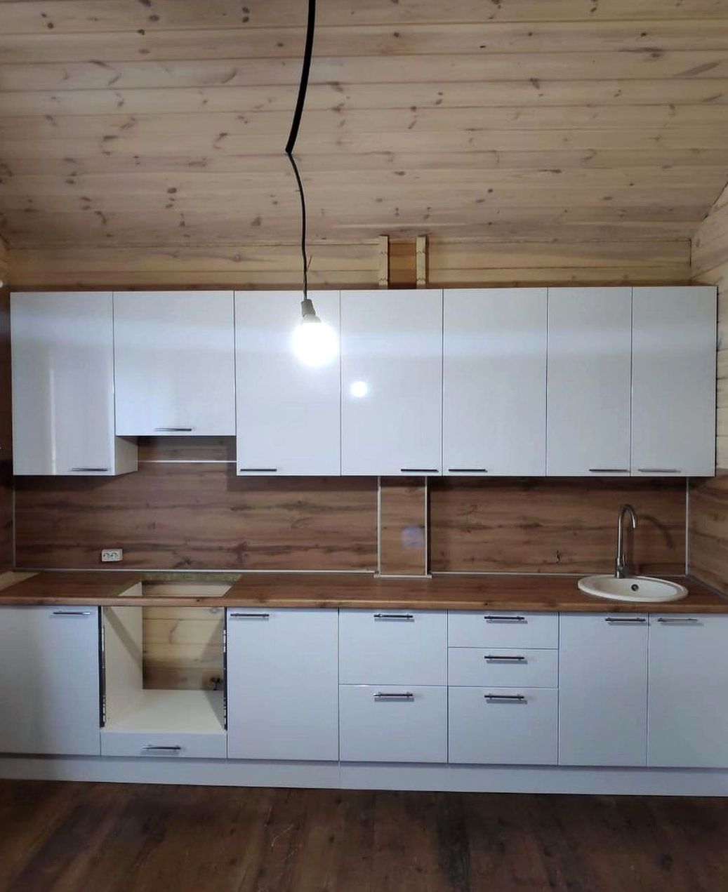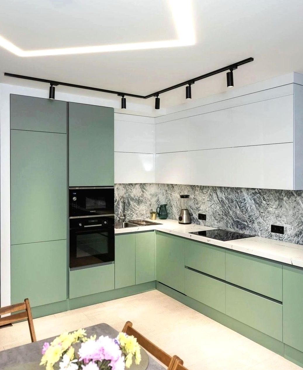 П-образная композиция, фрезерованный МДФ, матовая эмаль отделка. Мягкая классика, уют, аккуратные рамочные фасады без перегруза