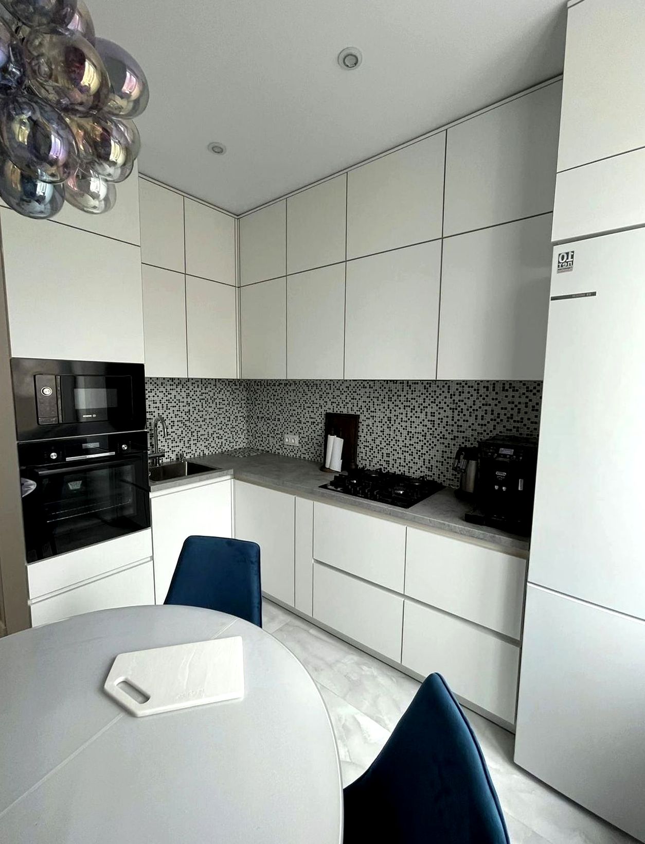 Угловая композиция, МДФ в пленке, супермат отделка. Эргономичная планировка, много хранения, актуальный городской интерьер