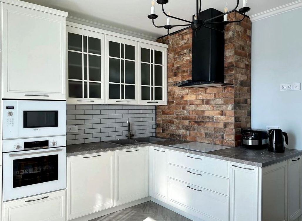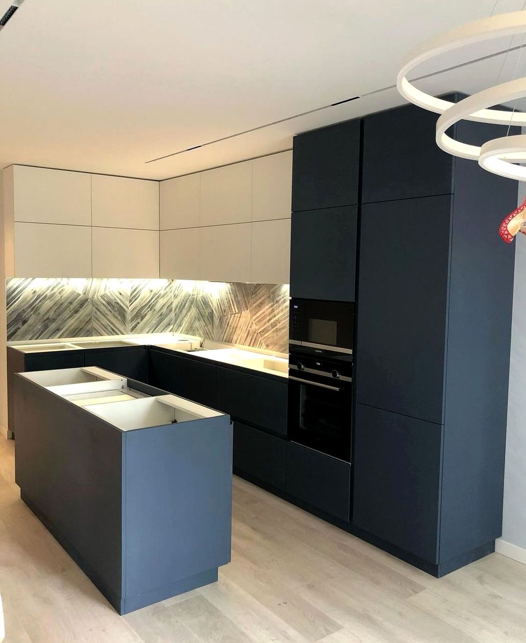 П-образная композиция, фрезерованный МДФ, матовая эмаль отделка. Мягкая классика, уют, аккуратные рамочные фасады без перегруза