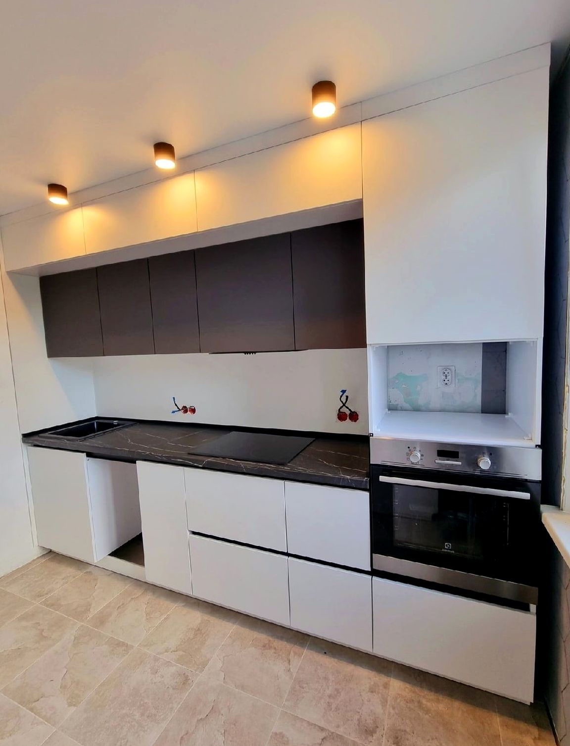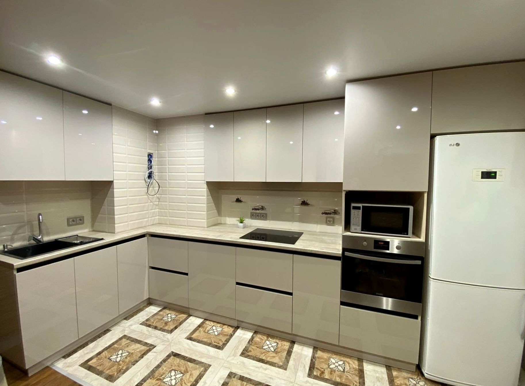 П-образная композиция, фрезерованный МДФ, матовая эмаль отделка. Мягкая классика, уют, аккуратные рамочные фасады без перегруза