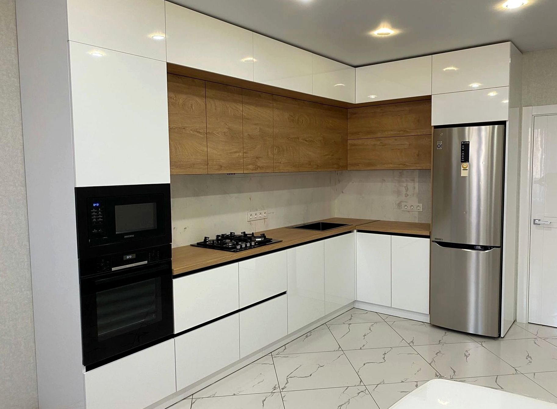 Угловая композиция, ЛДСП / МДФ, светлая текстура отделка. Светлый интерьер, теплая атмосфера, практичность для ежедневного использования