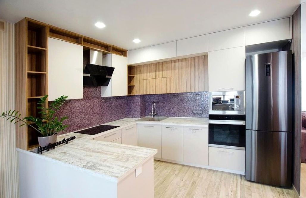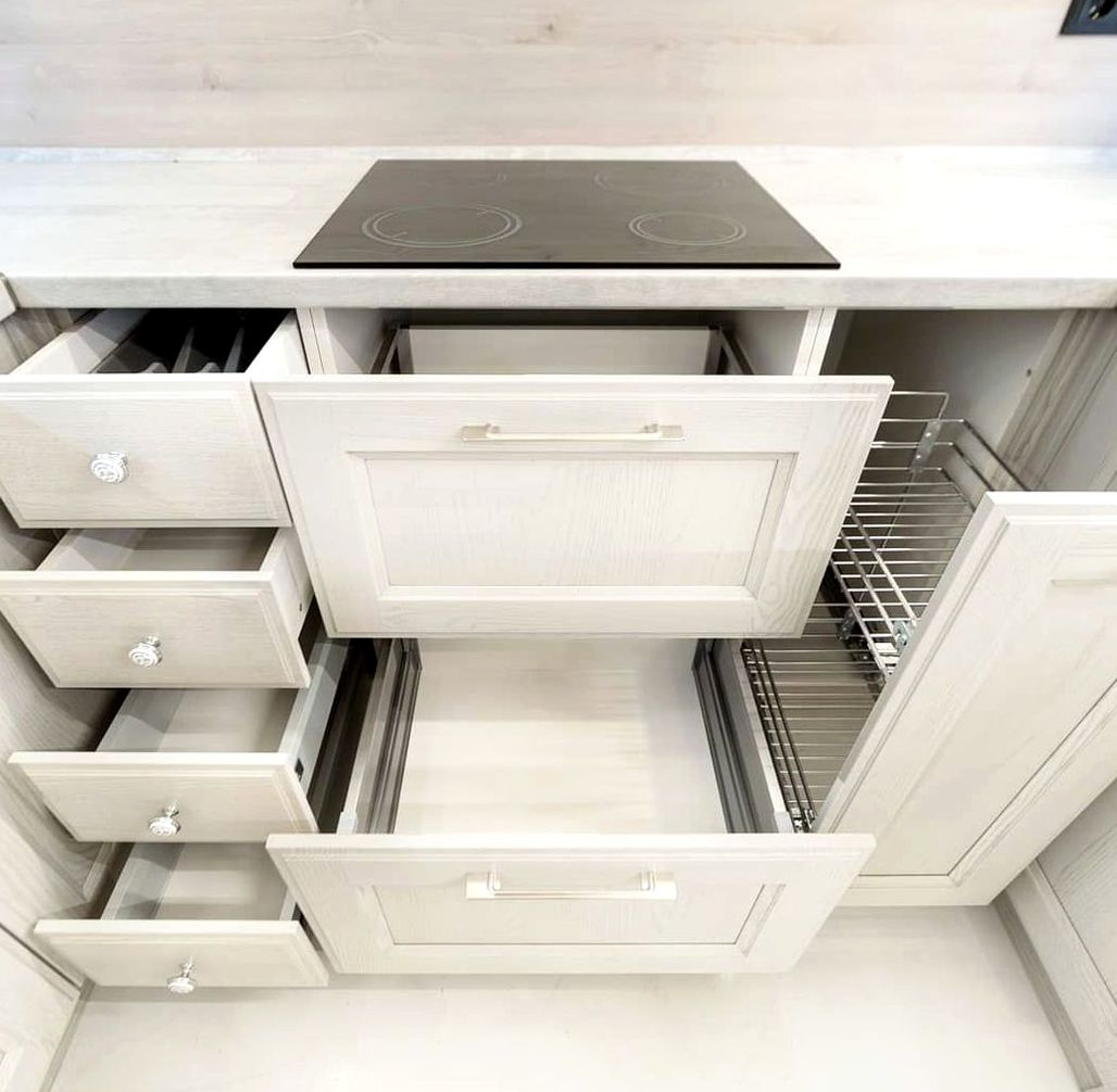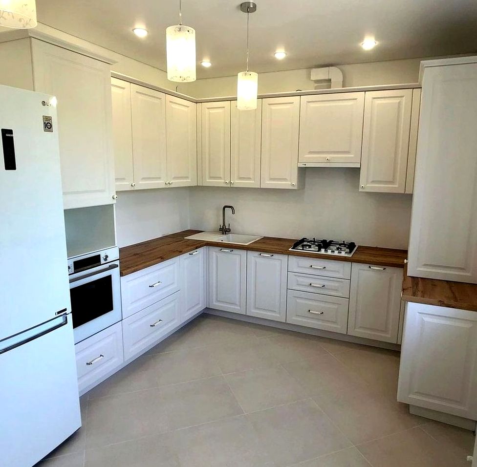 П-образная композиция, фрезерованный МДФ, матовая эмаль отделка. Мягкая классика, уют, аккуратные рамочные фасады без перегруза