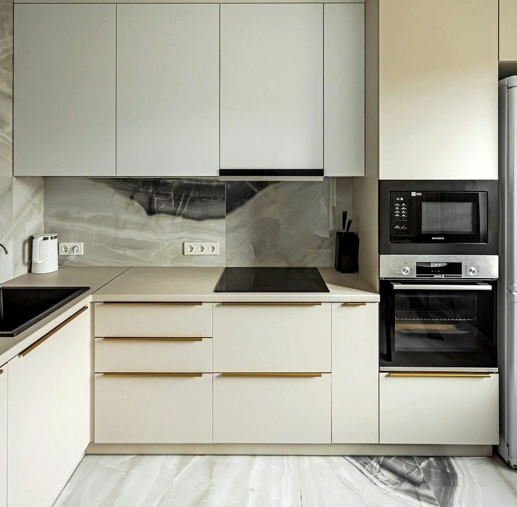 Угловая композиция, МДФ в пленке, супермат отделка. Эргономичная планировка, много хранения, актуальный городской интерьер
