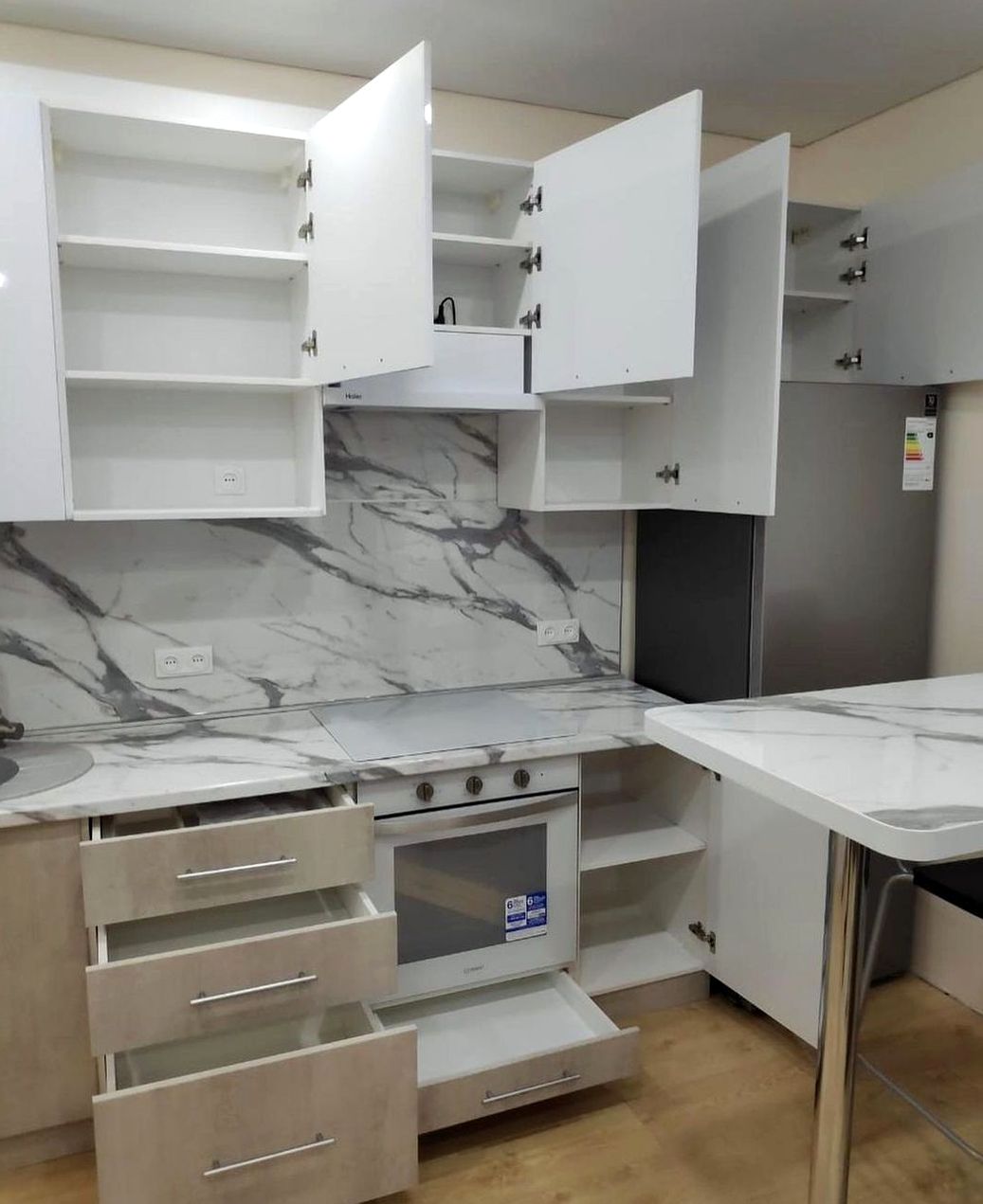 Угловая композиция, МДФ в пленке, супермат отделка. Эргономичная планировка, много хранения, актуальный городской интерьер