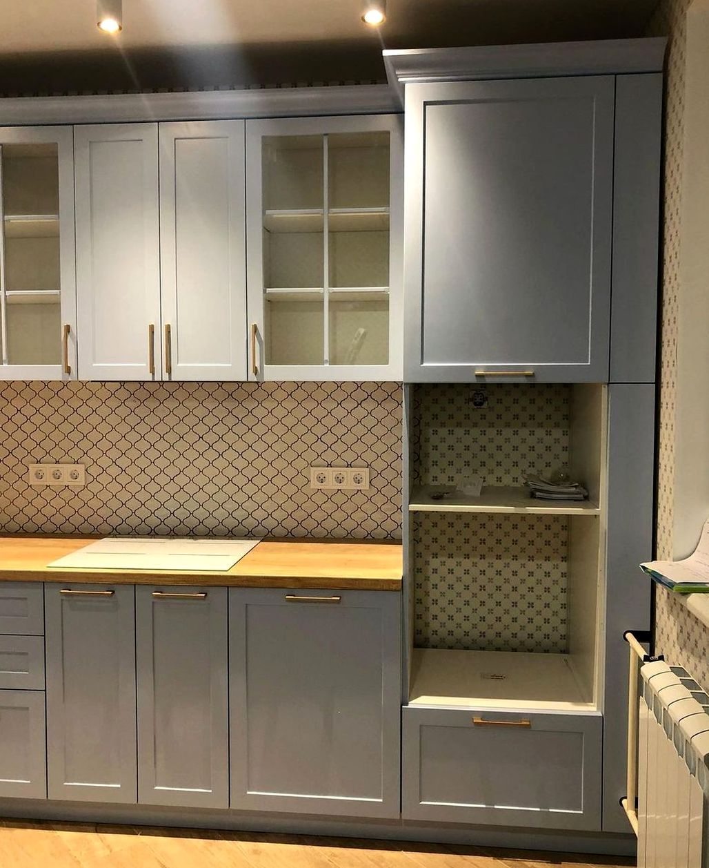 Угловая композиция, МДФ в пленке, супермат отделка. Эргономичная планировка, много хранения, актуальный городской интерьер