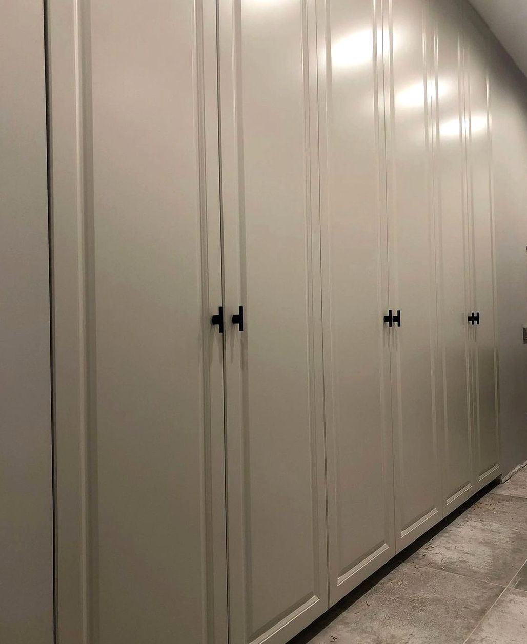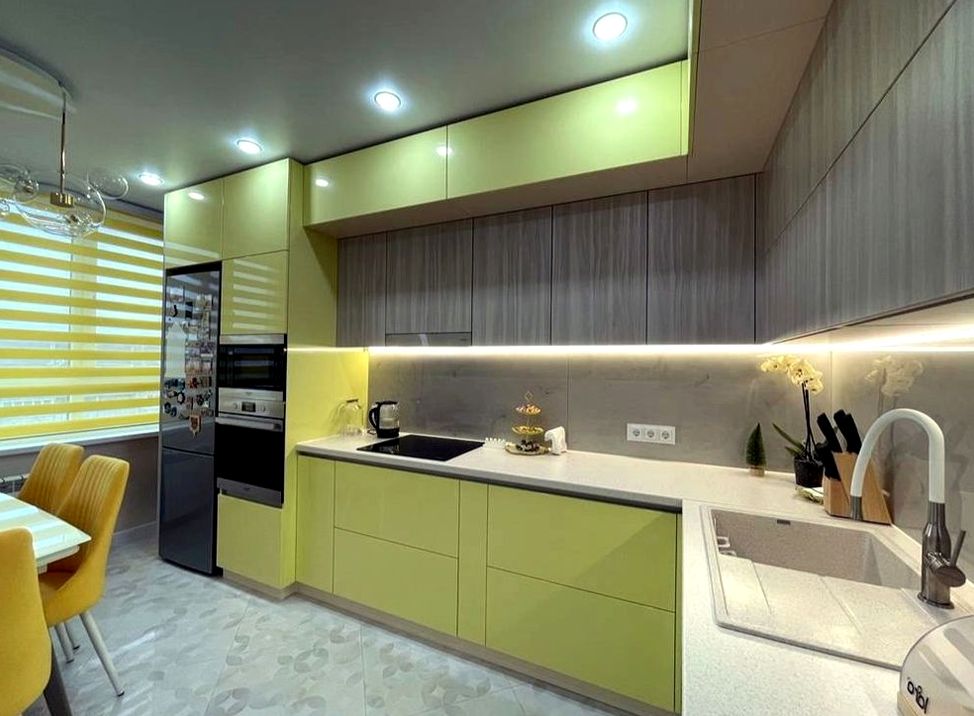 П-образная композиция, фрезерованный МДФ, матовая эмаль отделка. Мягкая классика, уют, аккуратные рамочные фасады без перегруза
