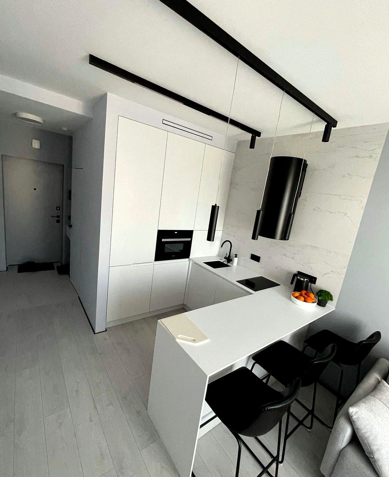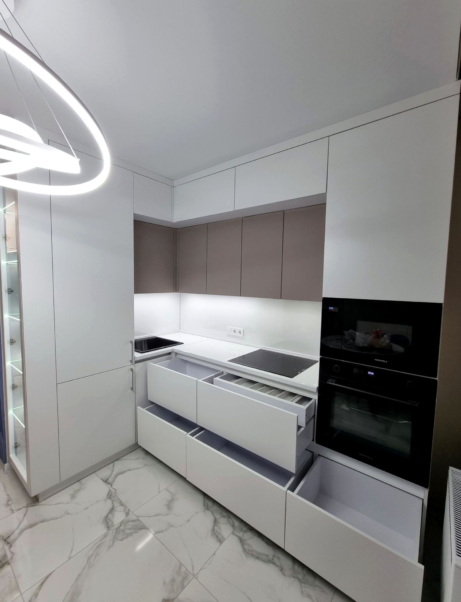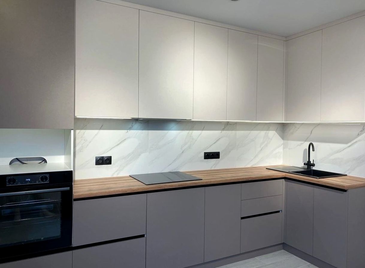 П-образная композиция, фрезерованный МДФ, матовая эмаль отделка. Мягкая классика, уют, аккуратные рамочные фасады без перегруза
