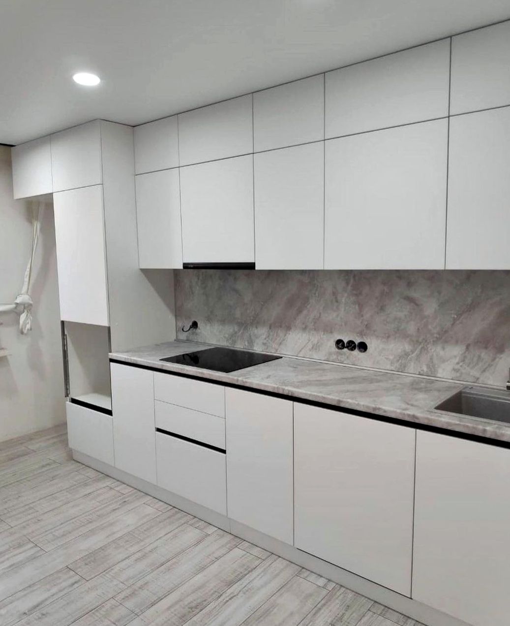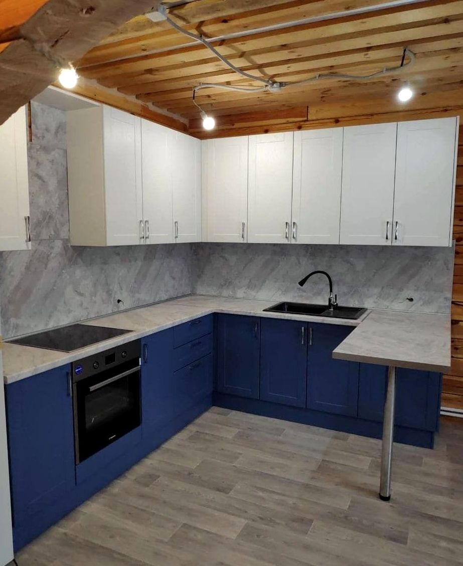 П-образная композиция, фрезерованный МДФ, матовая эмаль отделка. Мягкая классика, уют, аккуратные рамочные фасады без перегруза