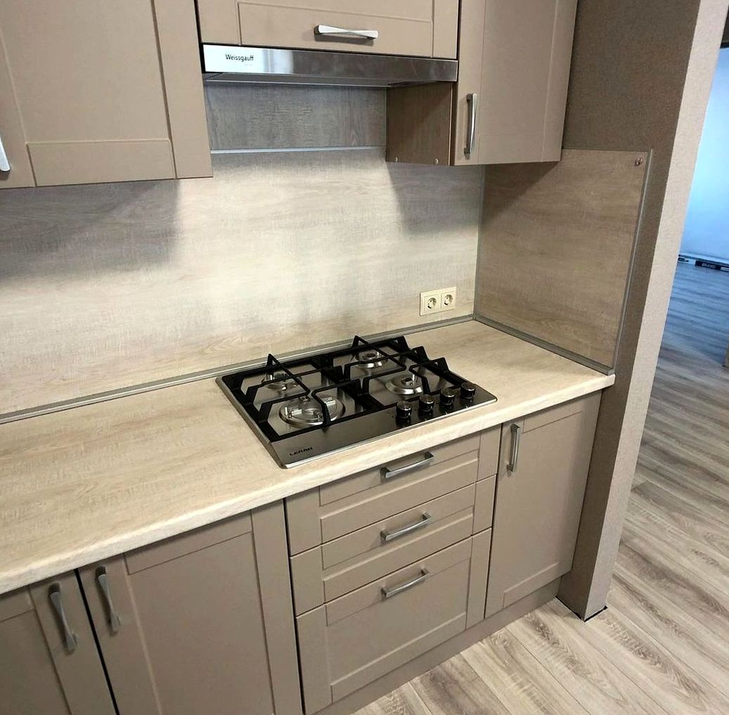 П-образная композиция, фрезерованный МДФ, матовая эмаль отделка. Мягкая классика, уют, аккуратные рамочные фасады без перегруза