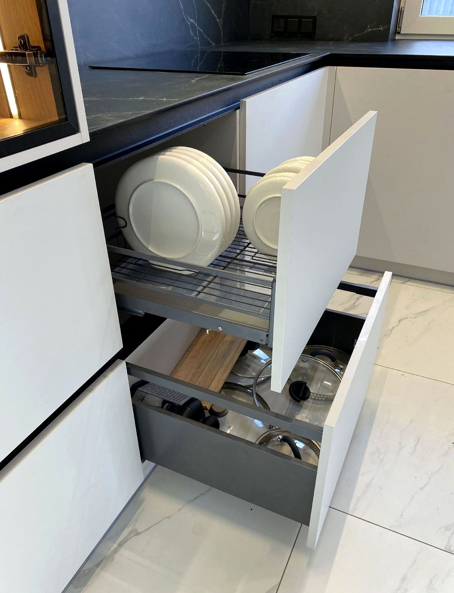 П-образная композиция, фрезерованный МДФ, матовая эмаль отделка. Мягкая классика, уют, аккуратные рамочные фасады без перегруза