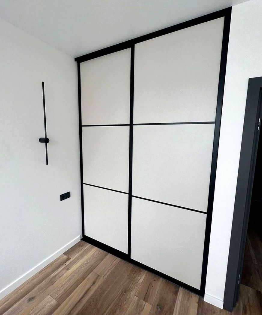 Встроенный шкаф, двери комбинированный, наполнение: секции под одежду, белье, ящики и подсветка. Вместительная система хранения с премиальным внешним видом