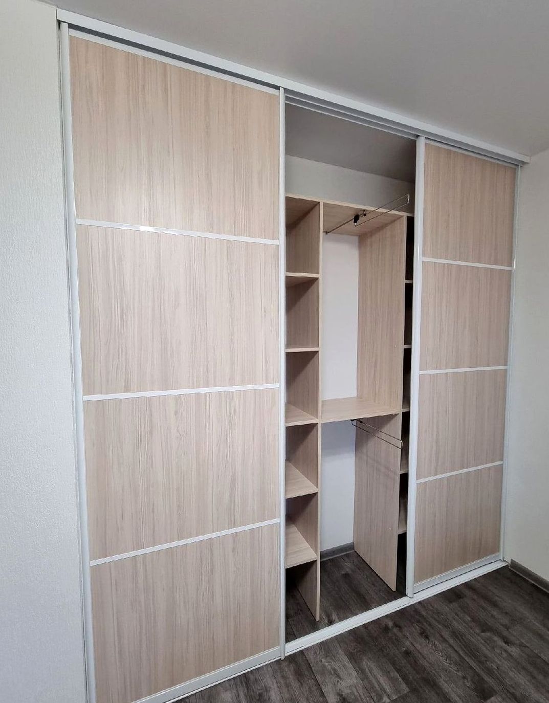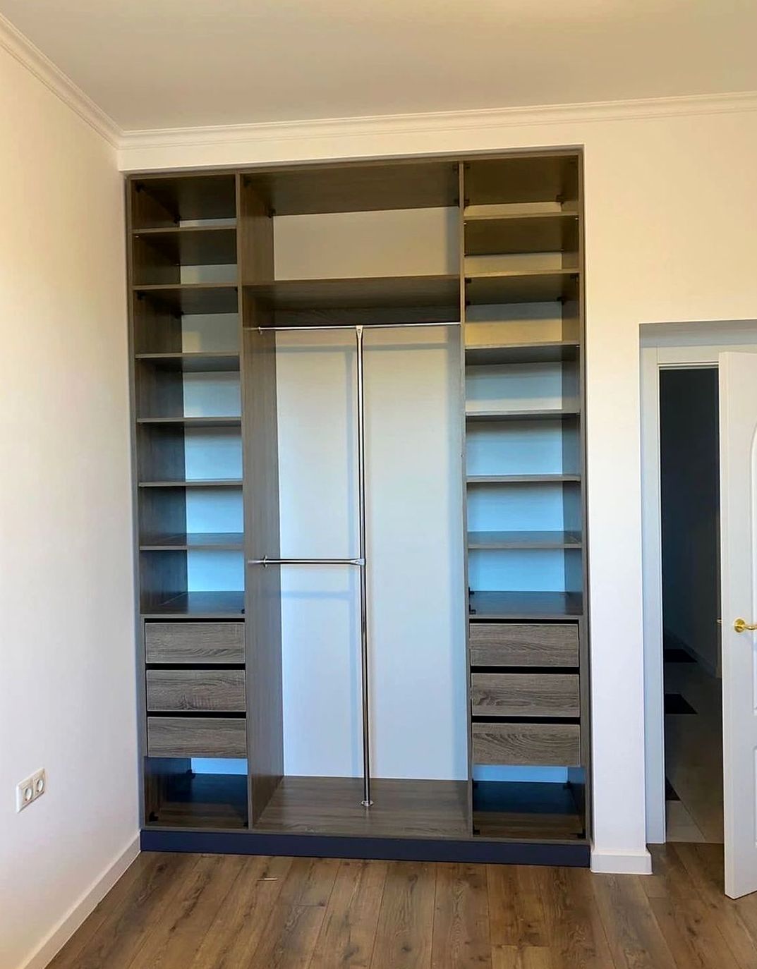 Корпусный шкаф, двери купе, наполнение: полки, штанги, ящики. Визуально расширяет пространство, сохраняет функциональность и порядок