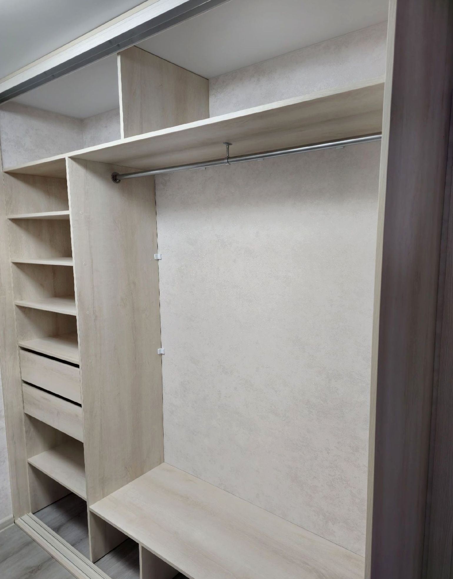 Встроенный шкаф, двери комбинированный, наполнение: секции под одежду, белье, ящики и подсветка. Вместительная система хранения с премиальным внешним видом