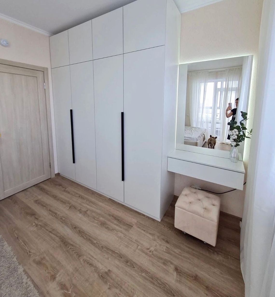 Встроенный шкаф, двери комбинированный, наполнение: секции под одежду, белье, ящики и подсветка. Вместительная система хранения с премиальным внешним видом
