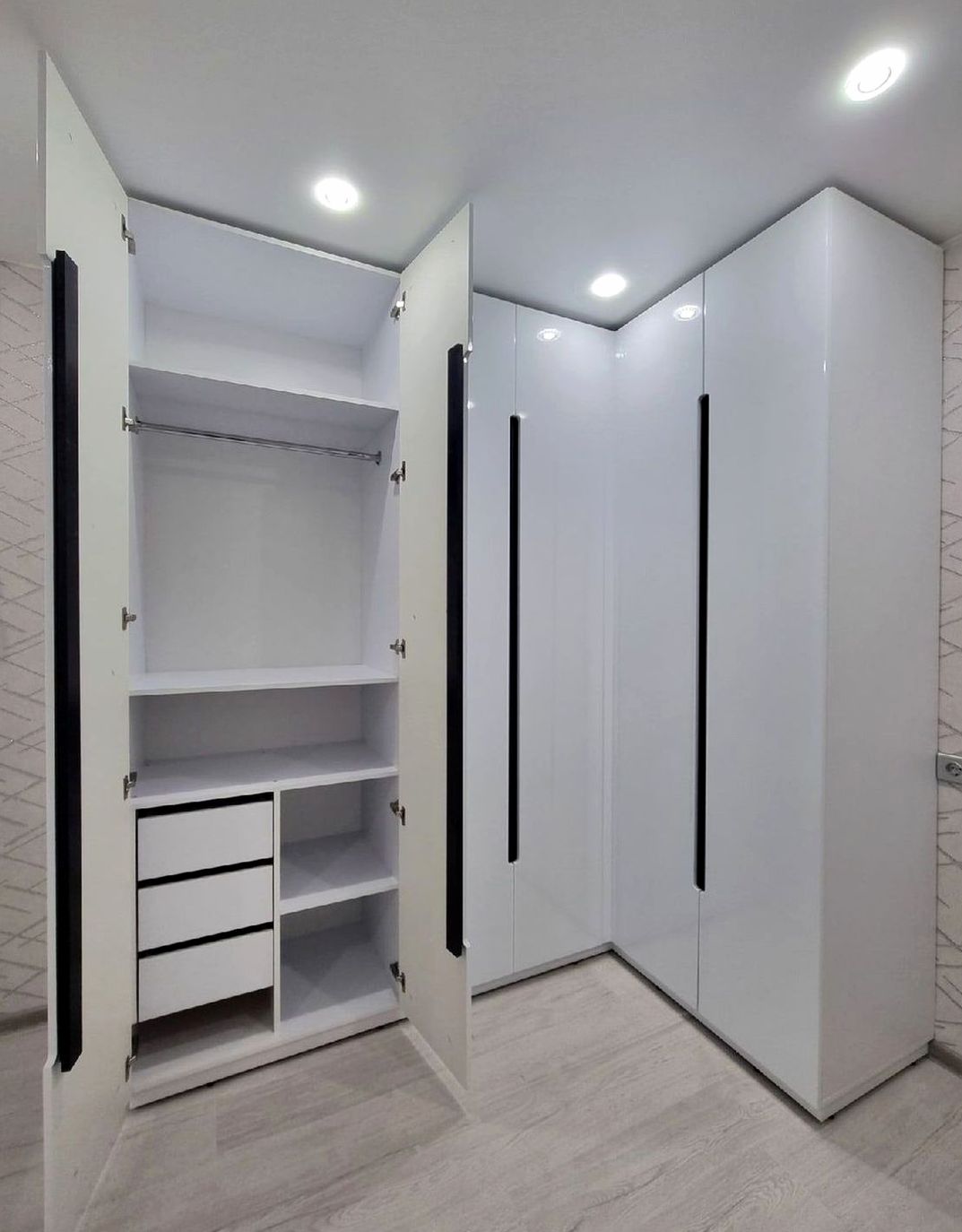 Встроенный шкаф, двери комбинированный, наполнение: секции под одежду, белье, ящики и подсветка. Вместительная система хранения с премиальным внешним видом