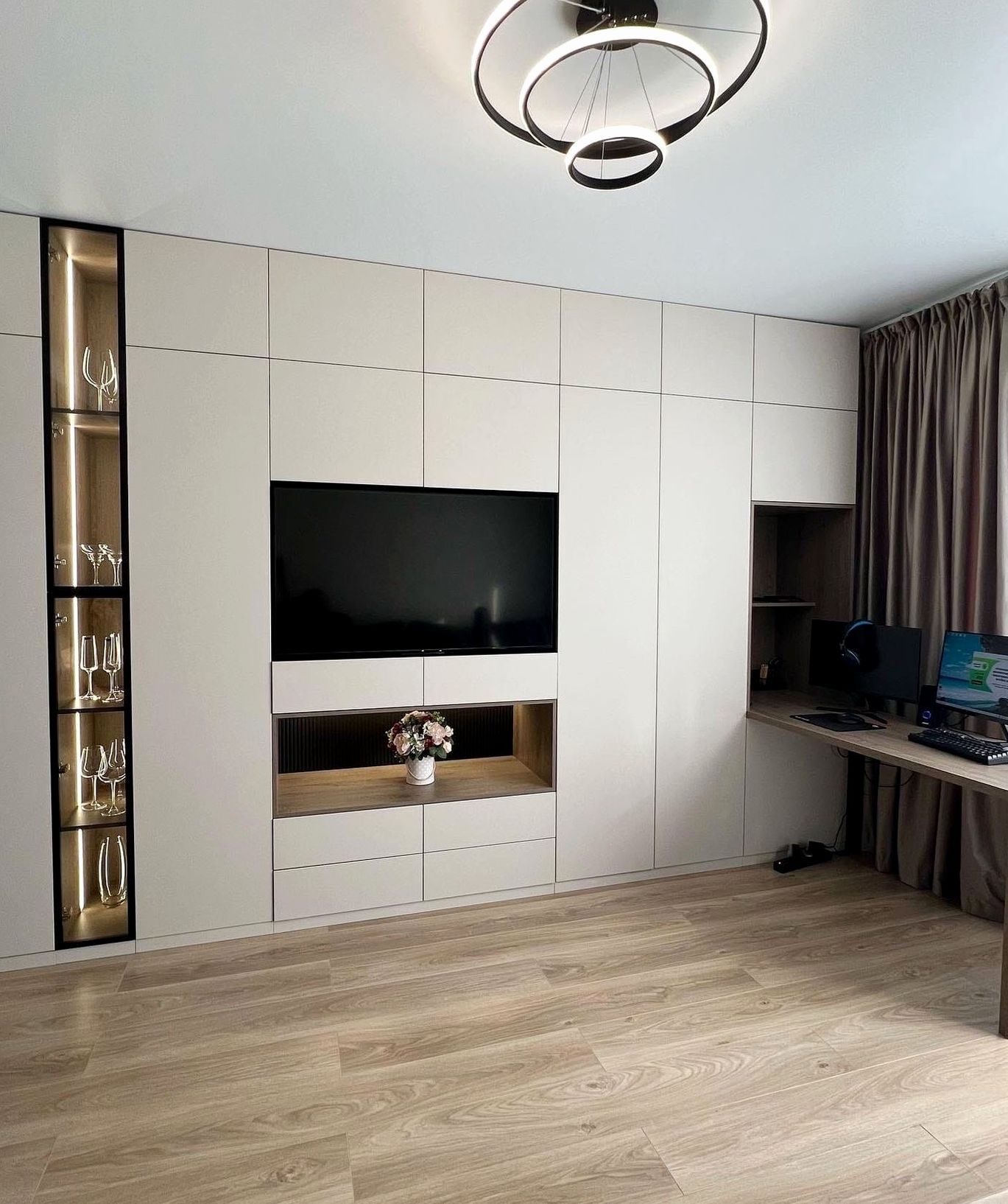 Корпусный шкаф, двери купе, наполнение: полки, штанги, ящики. Визуально расширяет пространство, сохраняет функциональность и порядок
