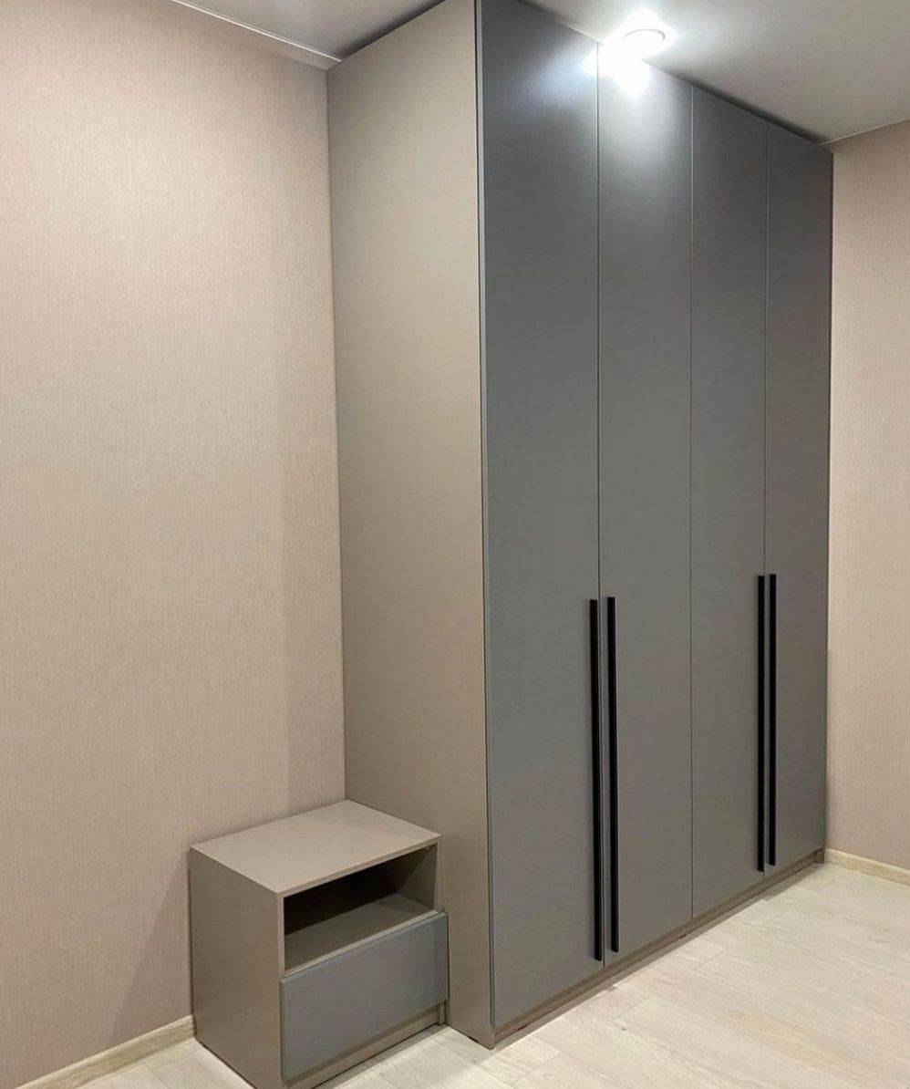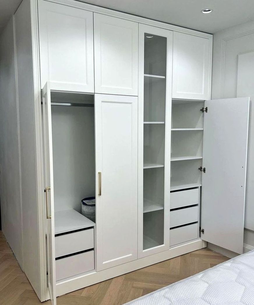 Корпусный шкаф, двери распашной, наполнение: полки, ящики, длинная одежда. Спокойный интерьер спальни, удобная организация вещей, уютный вид