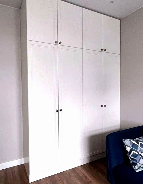 Корпусный шкаф, двери распашной, наполнение: полки, ящики, длинная одежда. Спокойный интерьер спальни, удобная организация вещей, уютный вид