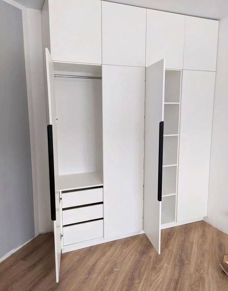 Корпусный шкаф, двери распашной, наполнение: полки, ящики, длинная одежда. Спокойный интерьер спальни, удобная организация вещей, уютный вид