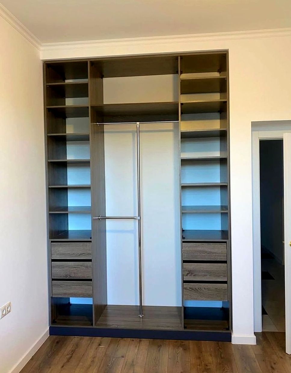Корпусный шкаф, двери распашной, наполнение: полки, ящики, длинная одежда. Спокойный интерьер спальни, удобная организация вещей, уютный вид