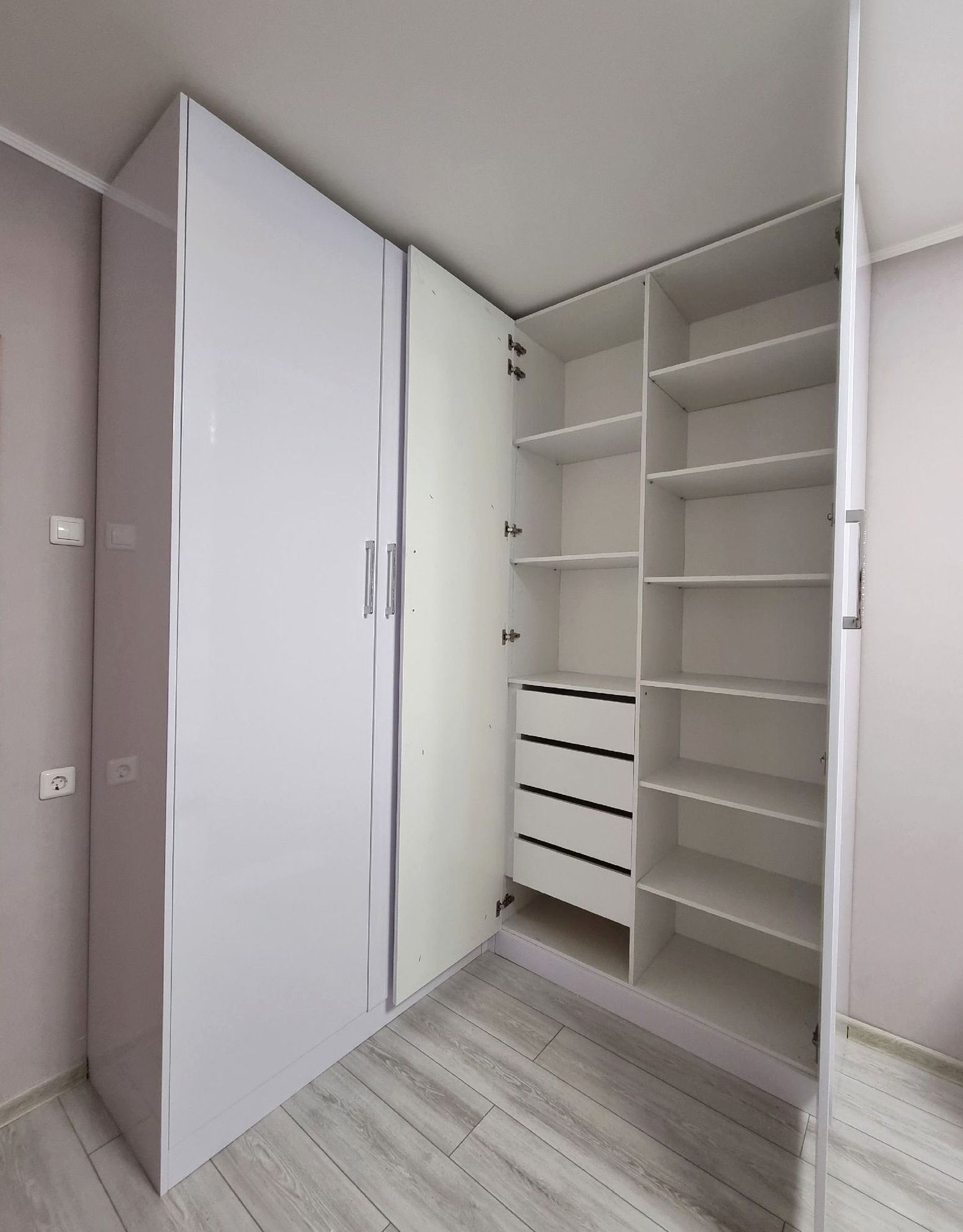 Корпусный шкаф, двери распашной, наполнение: полки и выдвижные ящики. Строгая геометрия, удобный ежедневный доступ, чистый фасадный ритм