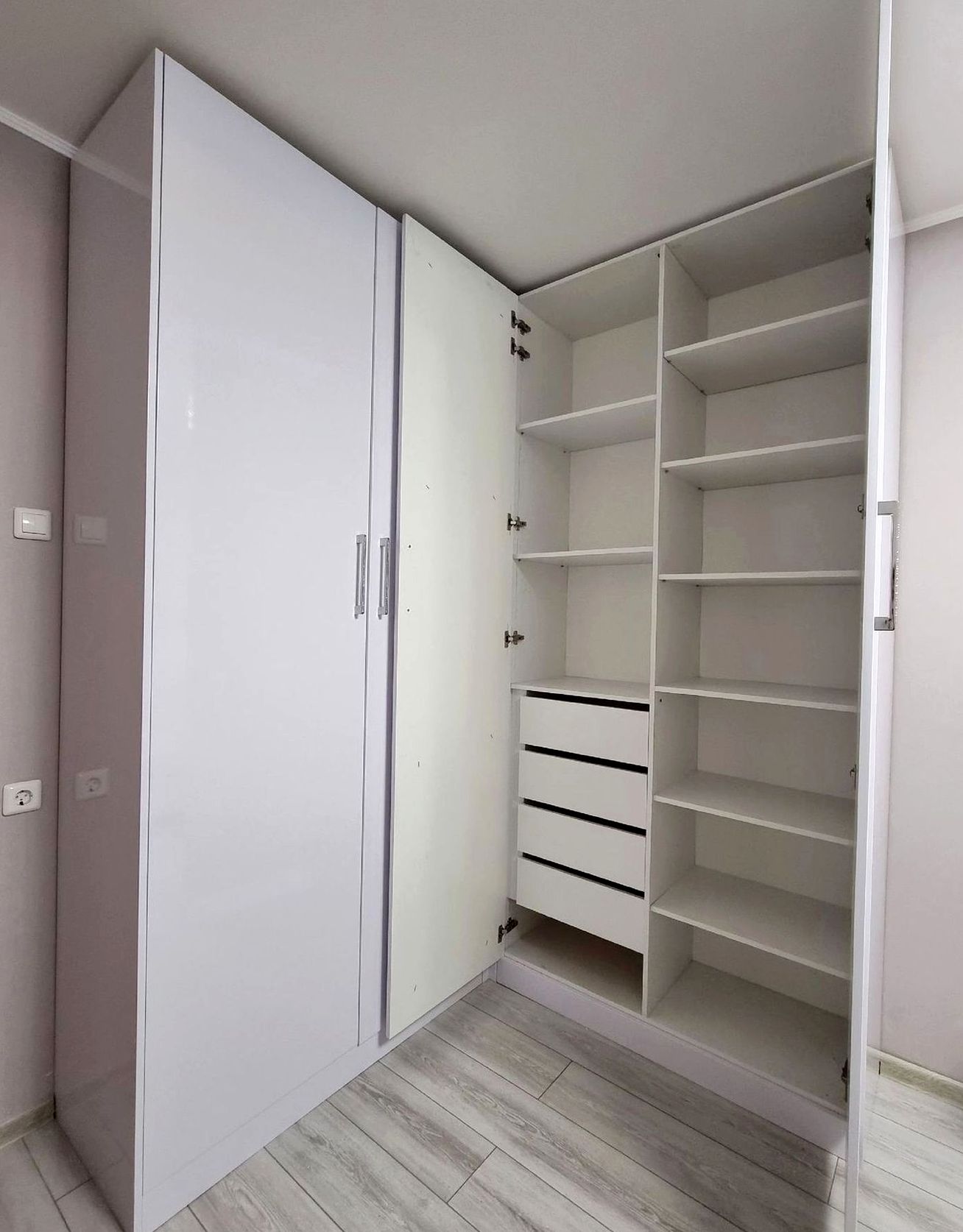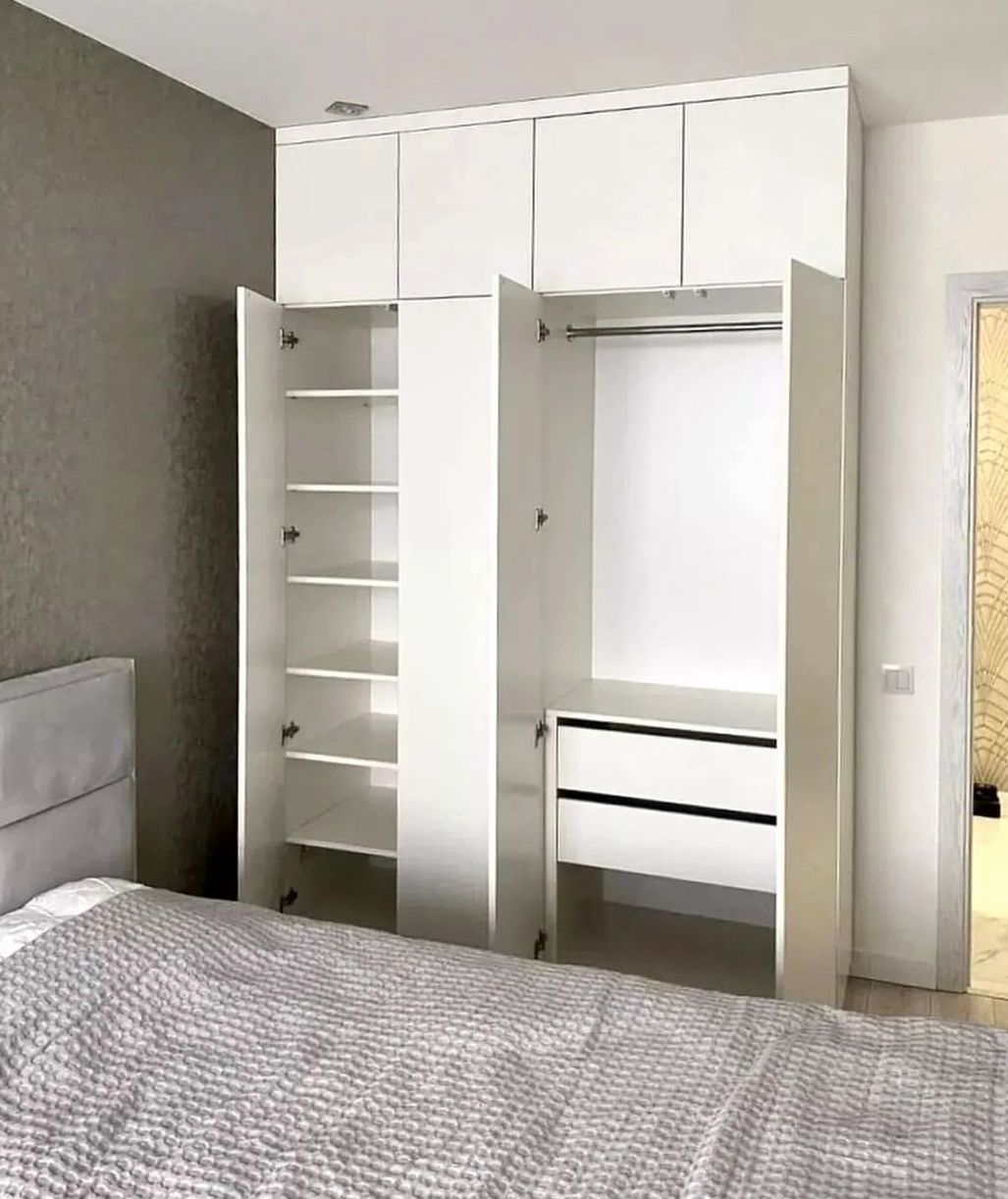 Корпусный шкаф, двери распашной, наполнение: полки и выдвижные ящики. Строгая геометрия, удобный ежедневный доступ, чистый фасадный ритм