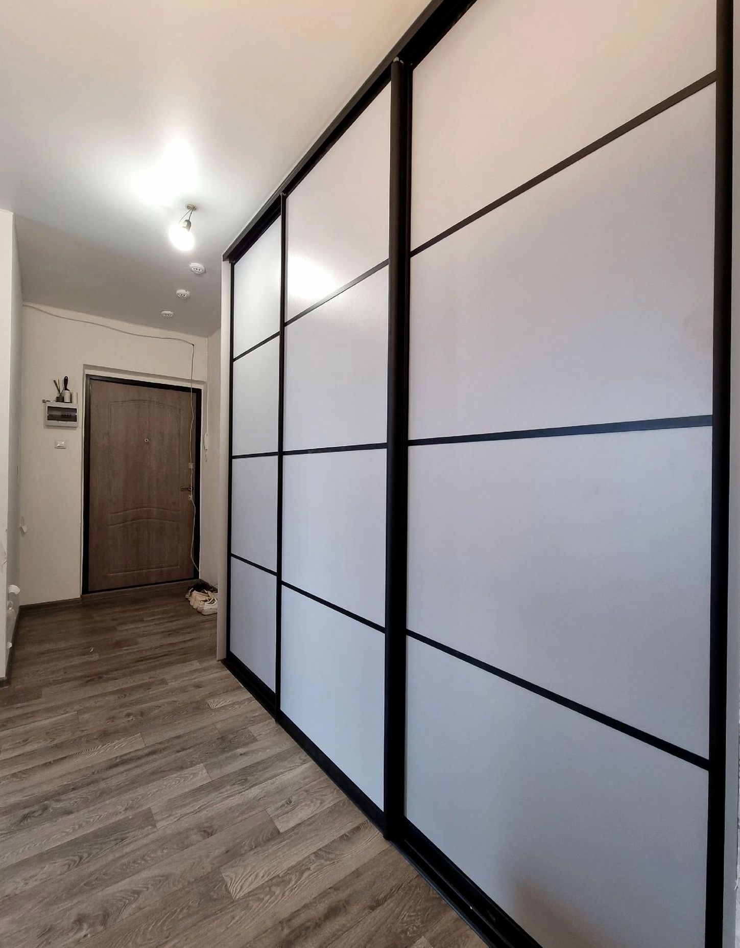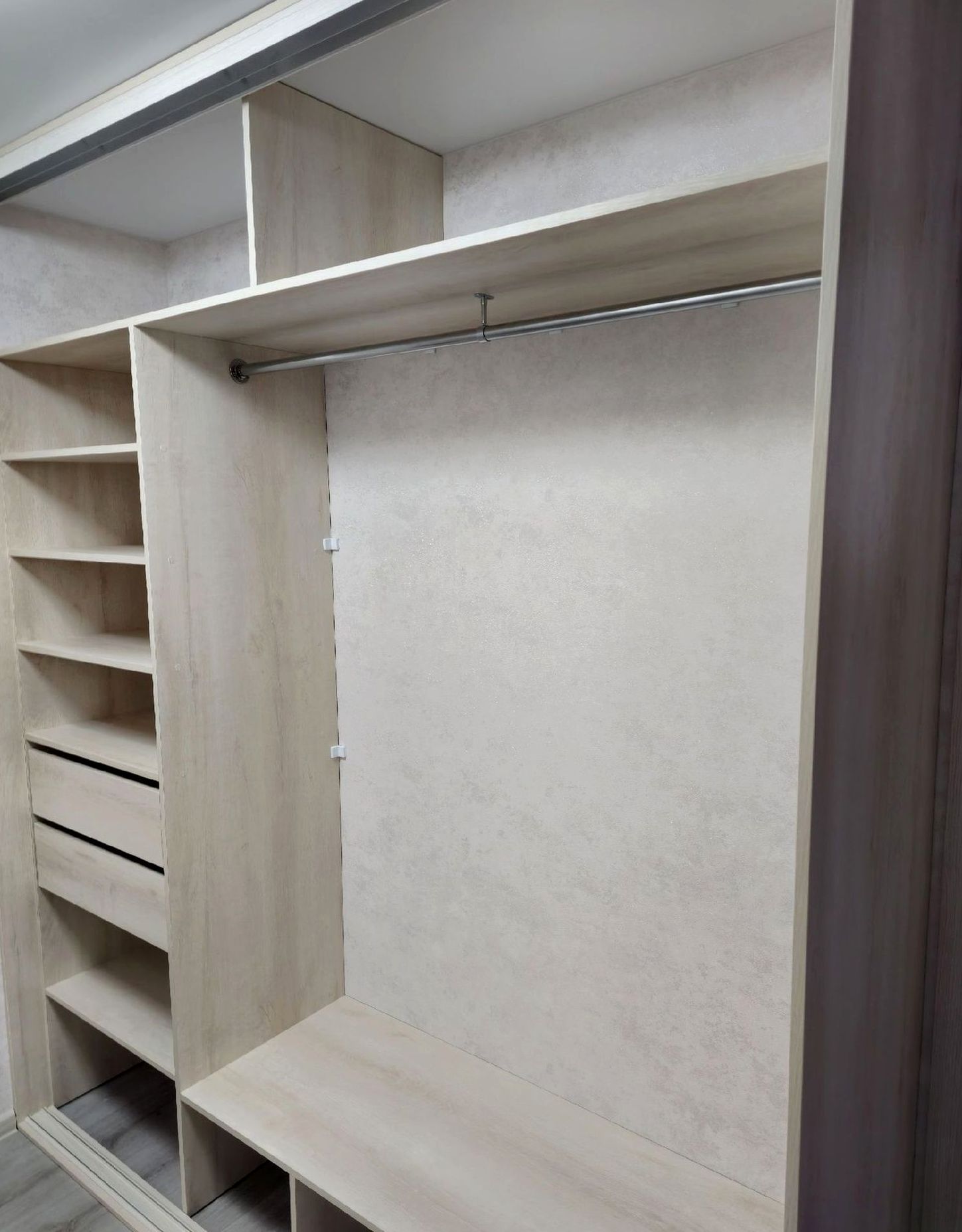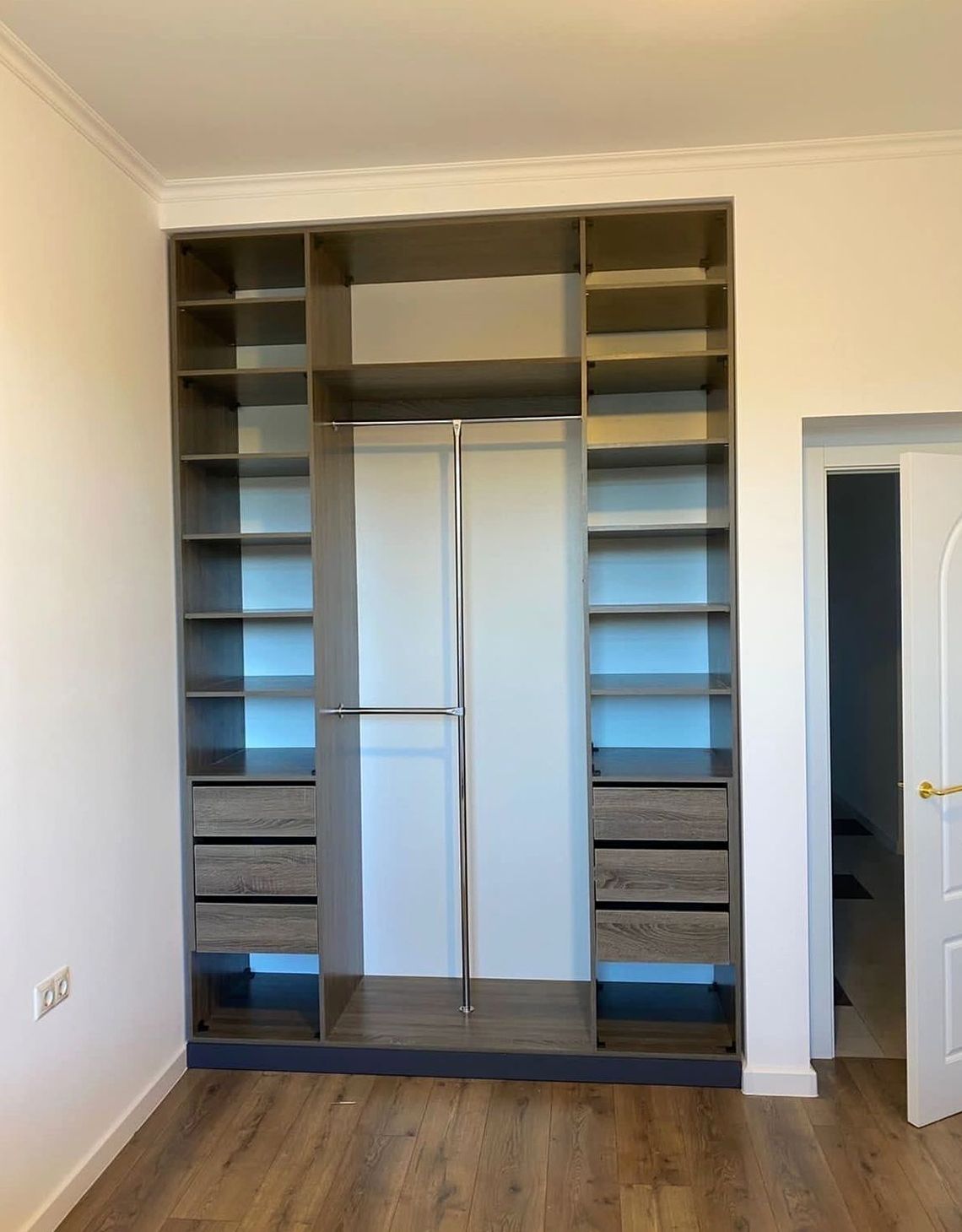 Встроенный шкаф, двери комбинированный, наполнение: секции под одежду, белье, ящики и подсветка. Вместительная система хранения с премиальным внешним видом