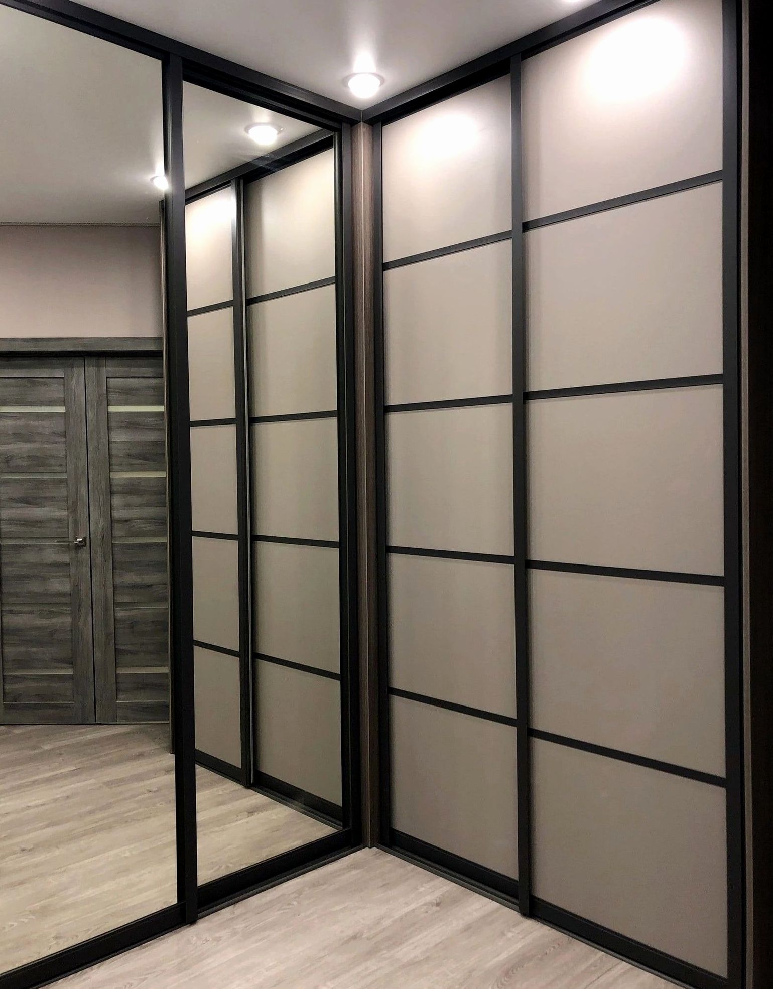 Встроенный шкаф, двери комбинированный, наполнение: секции под одежду, белье, ящики и подсветка. Вместительная система хранения с премиальным внешним видом