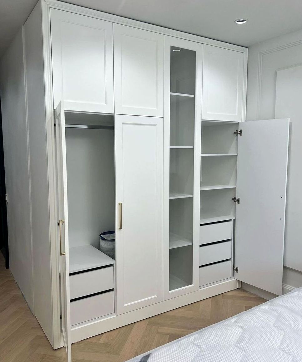 Корпусный шкаф, двери распашной, наполнение: полки, ящики, длинная одежда. Спокойный интерьер спальни, удобная организация вещей, уютный вид