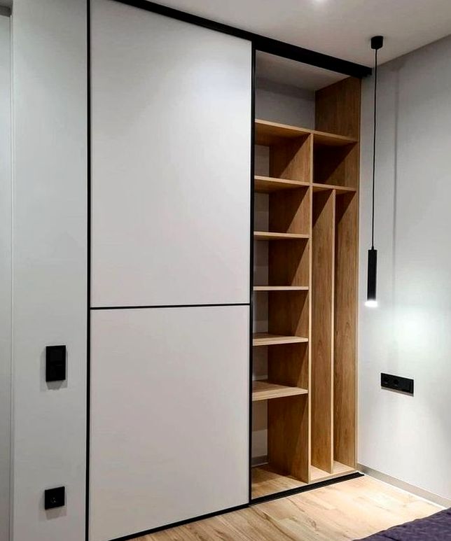 Встроенный шкаф, двери комбинированный, наполнение: секции под одежду, белье, ящики и подсветка. Вместительная система хранения с премиальным внешним видом