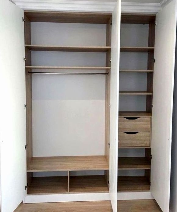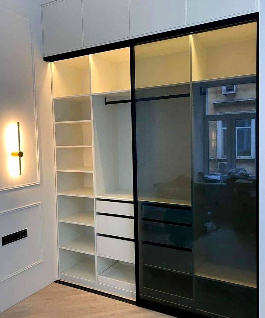 Корпусный шкаф, двери купе, наполнение: полки, штанги, ящики. Визуально расширяет пространство, сохраняет функциональность и порядок