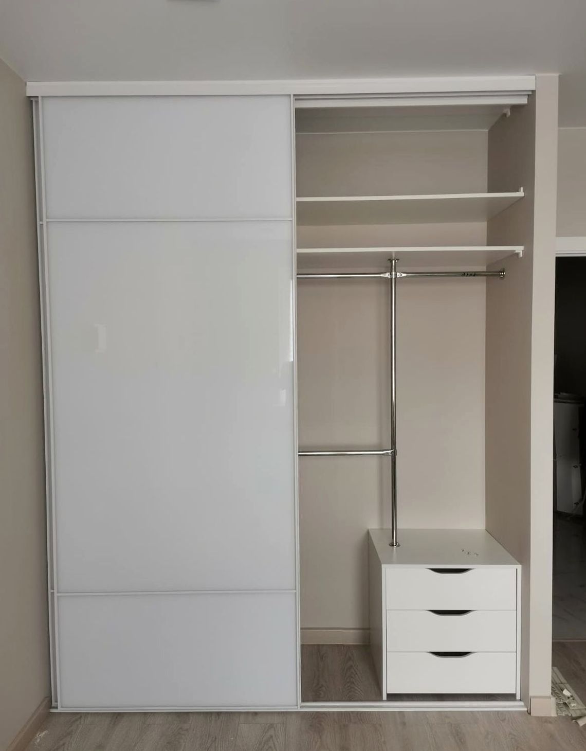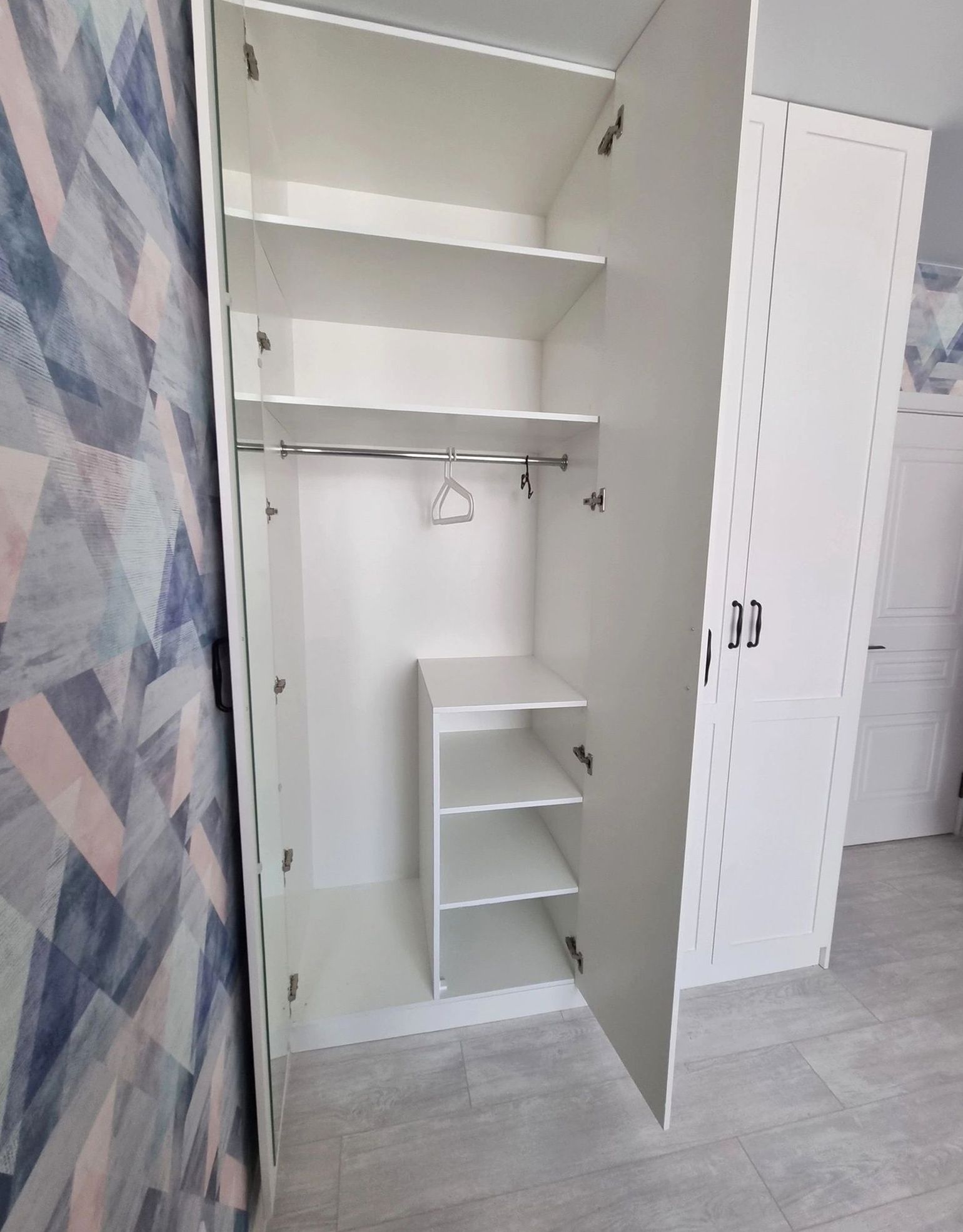 Встроенный шкаф, двери купе, наполнение: полки, штанги, антресоль. Максимум хранения без перегруза пространства, аккуратное встраивание в нишу