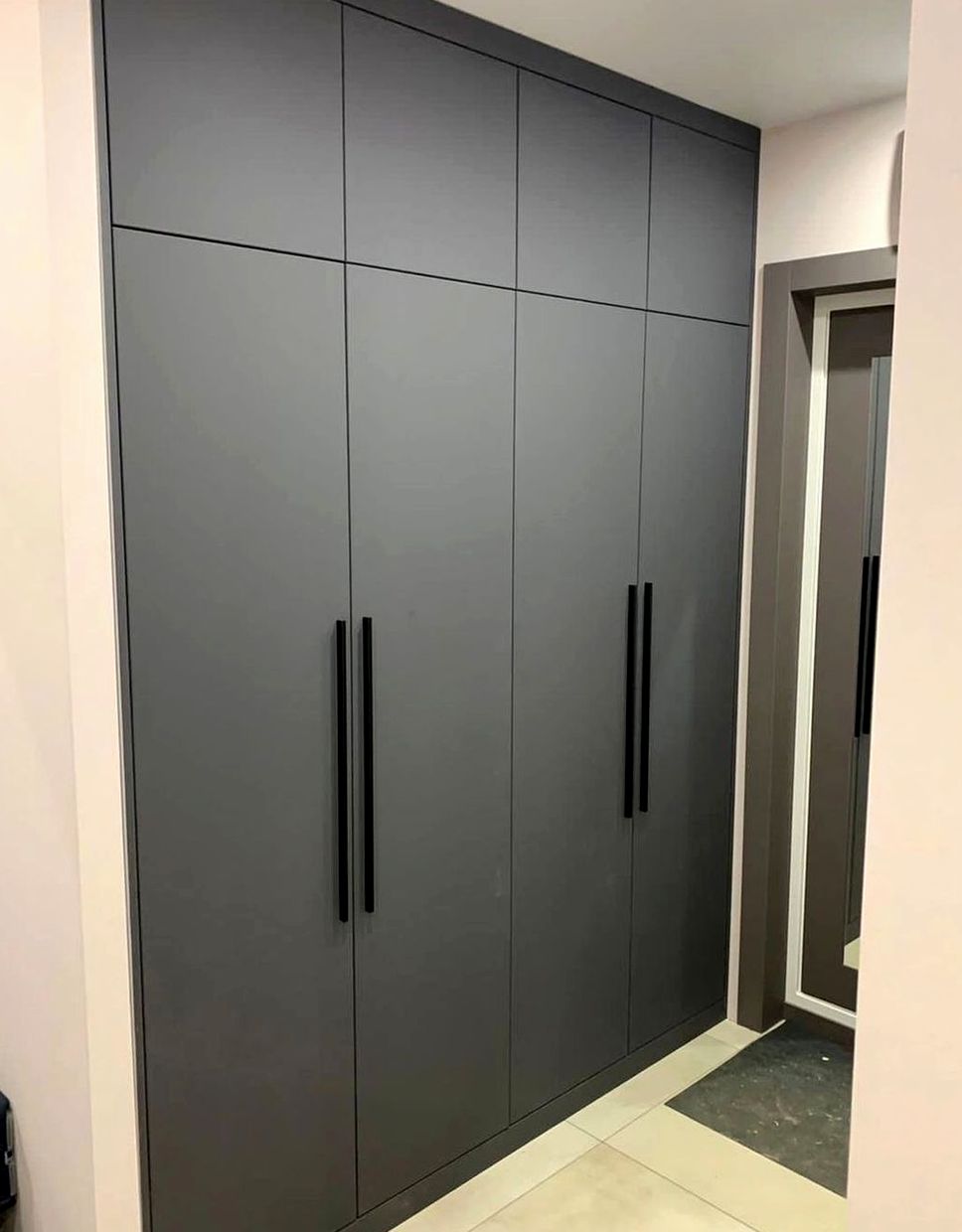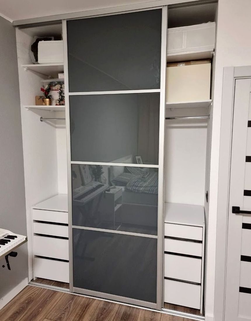 Встроенный шкаф, двери комбинированный, наполнение: секции под одежду, белье, ящики и подсветка. Вместительная система хранения с премиальным внешним видом