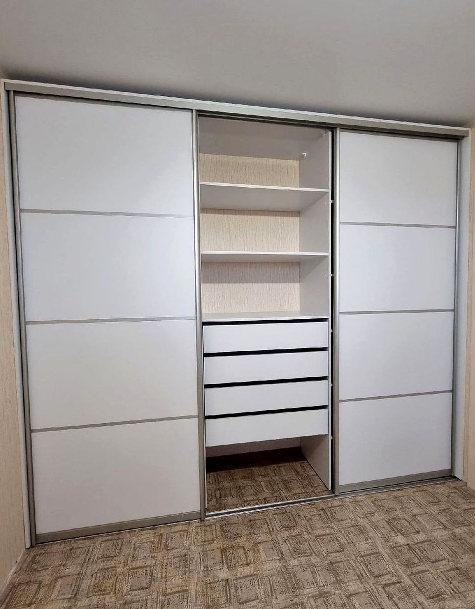 Корпусный шкаф, двери распашной, наполнение: полки, ящики, длинная одежда. Спокойный интерьер спальни, удобная организация вещей, уютный вид