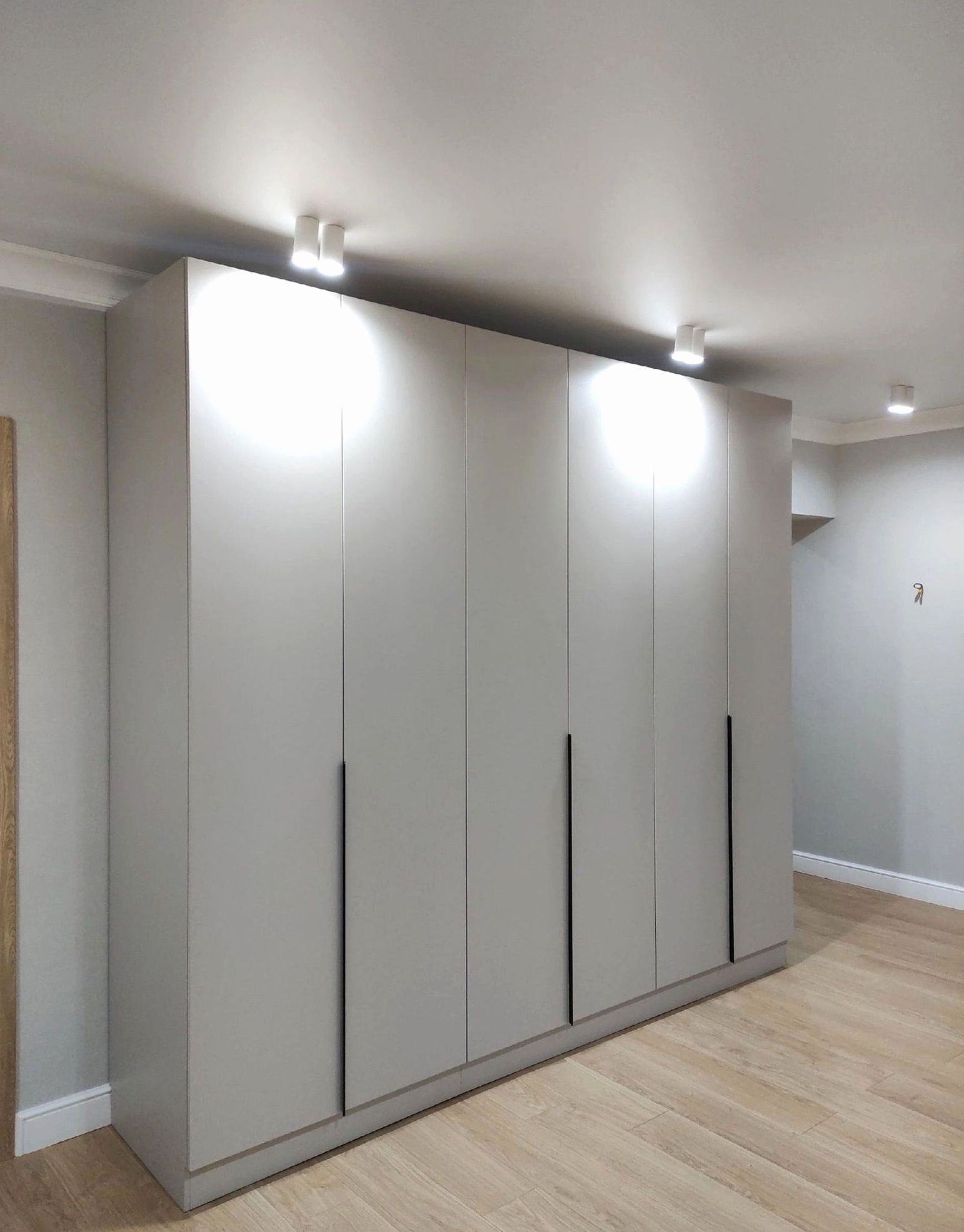 Встроенный шкаф, двери купе, наполнение: полки, штанги, антресоль. Максимум хранения без перегруза пространства, аккуратное встраивание в нишу